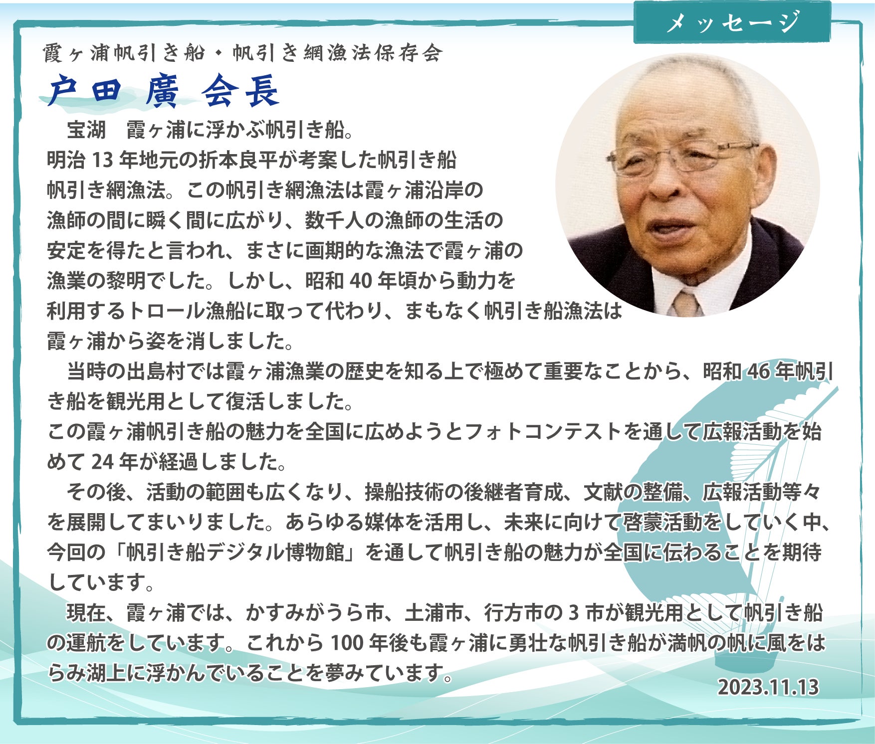 「帆引き船デジタル博物館」を通して帆引き船の歴史や文化のみならず霞ヶ浦の今を世に伝えることで、霞ヶ浦の環境にも興味を持って頂き、皆さんと共に霞ヶ浦を盛り上げたいと願っております。
