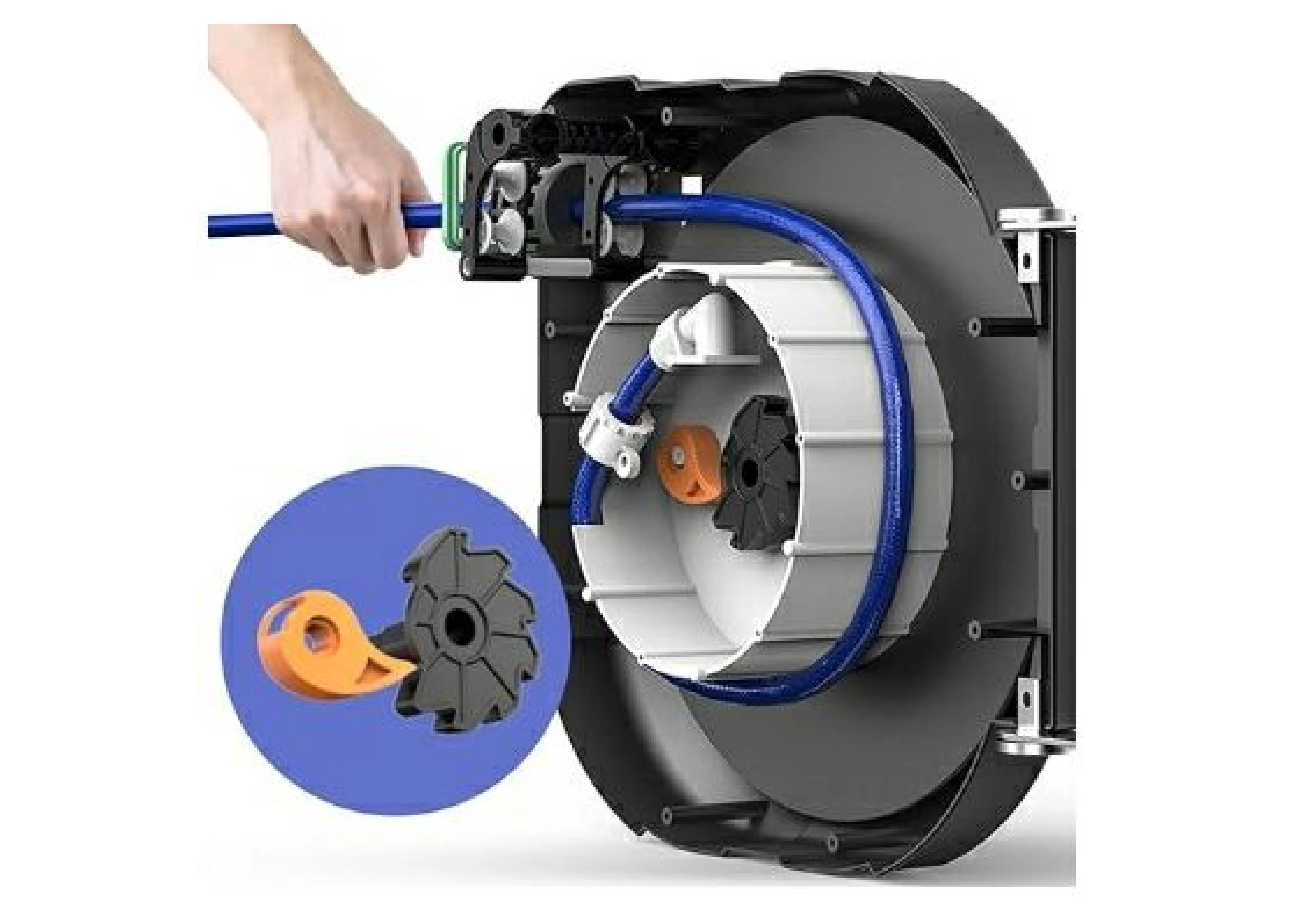 ホースを自動巻き取りする時、掃除機の電源コードを収納する時の様に手放しですると、収納スピードが 速いため本体を傷めることになります。ホースを持ちゆっくりと戻す感じで収納してください。