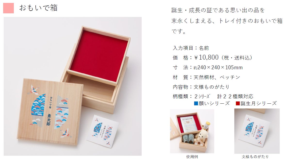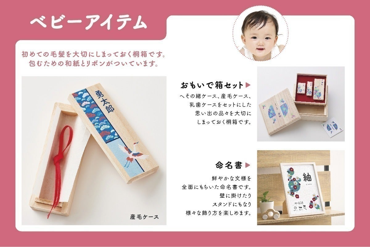 そんなかけがえのない幼い時の思い出の品を大事にしまっておける桐箱シリーズです。