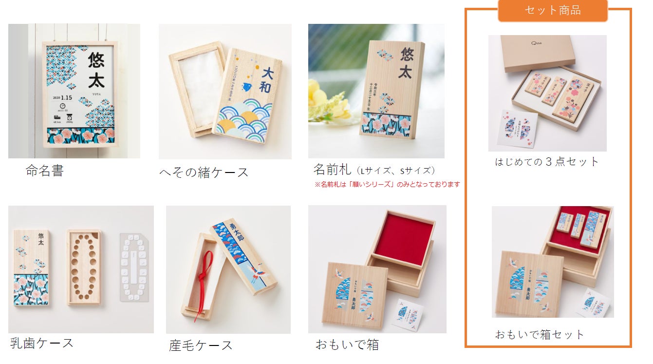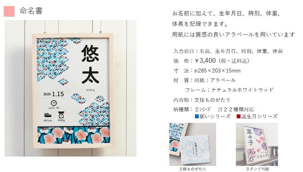 「願いシリーズ」では多くのパパママが我が子に対する「願い」や「想い」にマッチした5種類の文様柄を2つの色パターンでご用意しました。