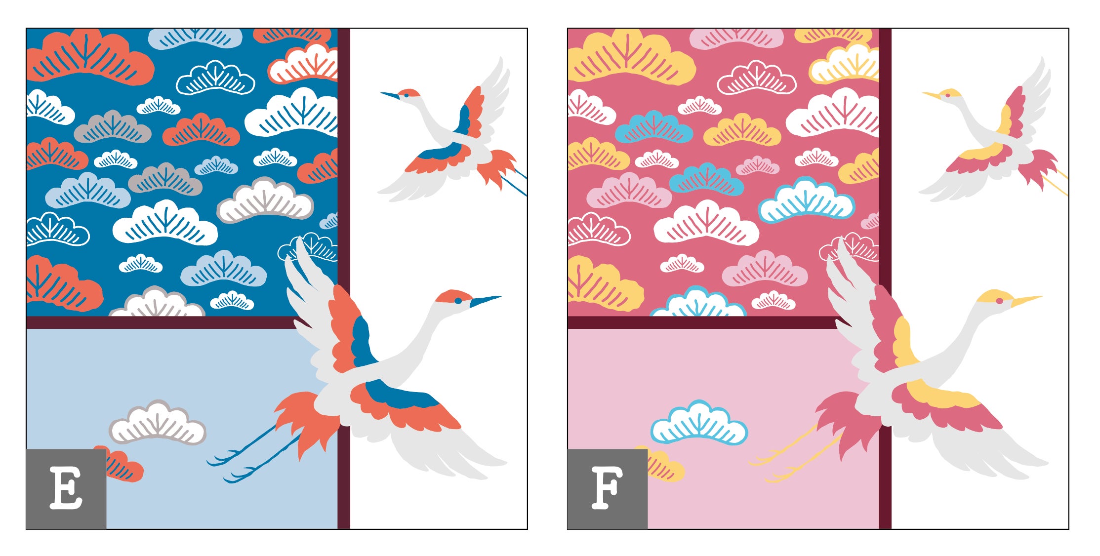 E:鶴・松(水色) F:鶴・松(ピンク)