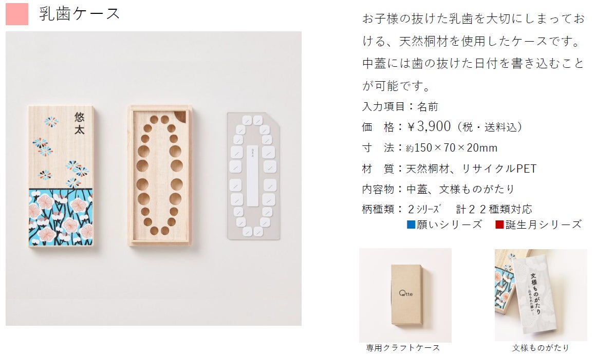 Qtteとはずっと気持ちをつないでくれる思い出を詰めるアイテムです。カジュアルで鮮やかな伝統文様に包まれた桐箱にはお名前をいれて世界に一つのメモリーギフトをお作りいたします。