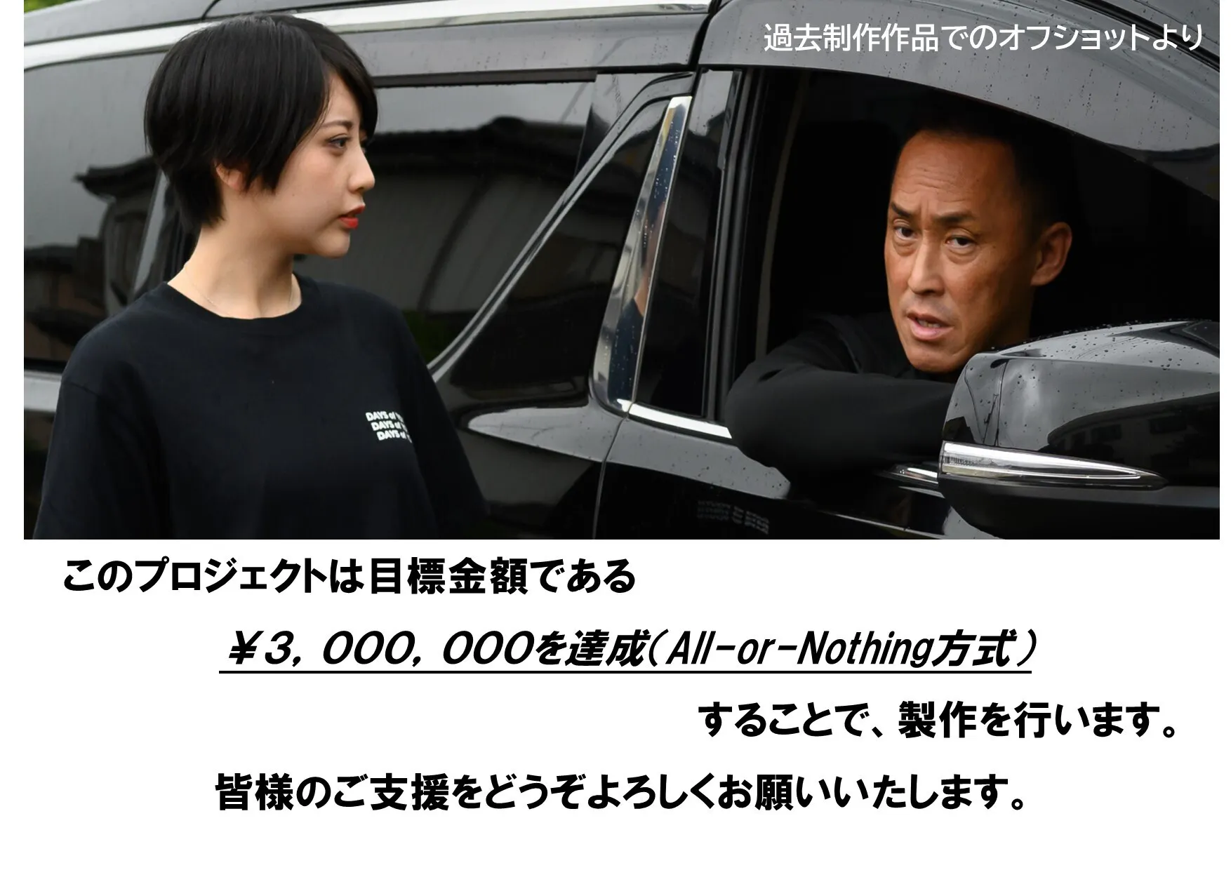 目標額達成の暁には、主演として立派に演じ、いいの出来たねと思っていただけるよう、精一杯頑張ります。