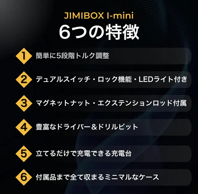 JIMIBOX I-miniはたくさん支援いただいたJIMIBOX X1-Iからツールを厳選して持ち運びやすくコンパクトにまとめた多機能セット。トルク調整機能やロック機能などの便利機能が詰まった多機能電動ドライバーと、立てたまま充電できる充電台、様々なビットと便利ツールを全てまとめてコンパクトに保管、持ち運びできるセットで、皆様にもっと自由にDIYを楽んでほしいという思いでプロジェクトを起案させていただきました。