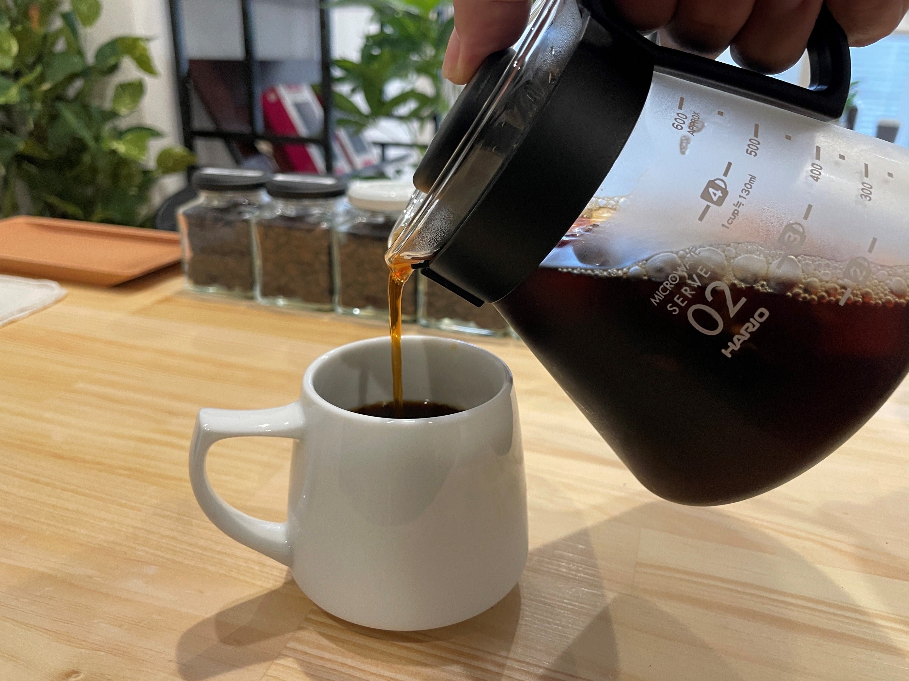 アイスコーヒーは、ホットコーヒーの倍以上のコーヒー豆を使用していて、一回の抽出で1.5杯分しか作れませんが、毎朝、急冷式で淹れています。