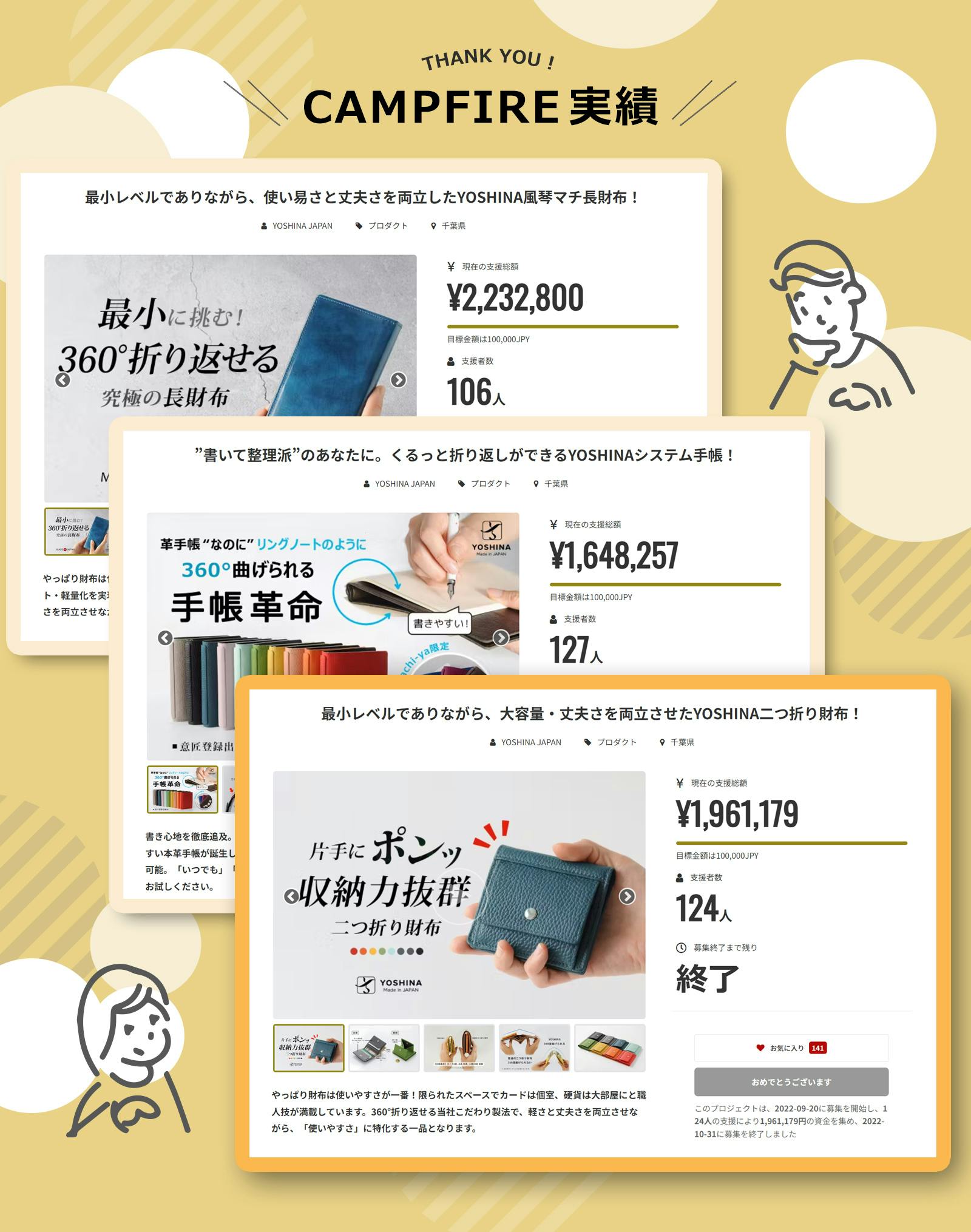 今回、YOSHINAコンパクト二つ折り財布について、多くの方から「リピート購入したいが、新色はないか」、「季節に合う色が欲しい」などのご要望を受け、Campfireのアンコールプロジェクトキャンペーンに参加することとなりました。