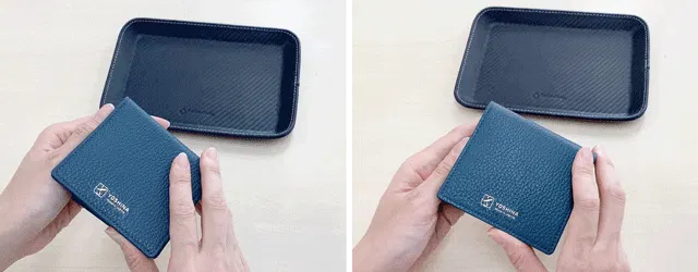 また、YOSHINAは牛革と豚革を貼り合わせるこだわり製法により360°折り返せるので、すべて取りたい方向からカードを取り出せます。