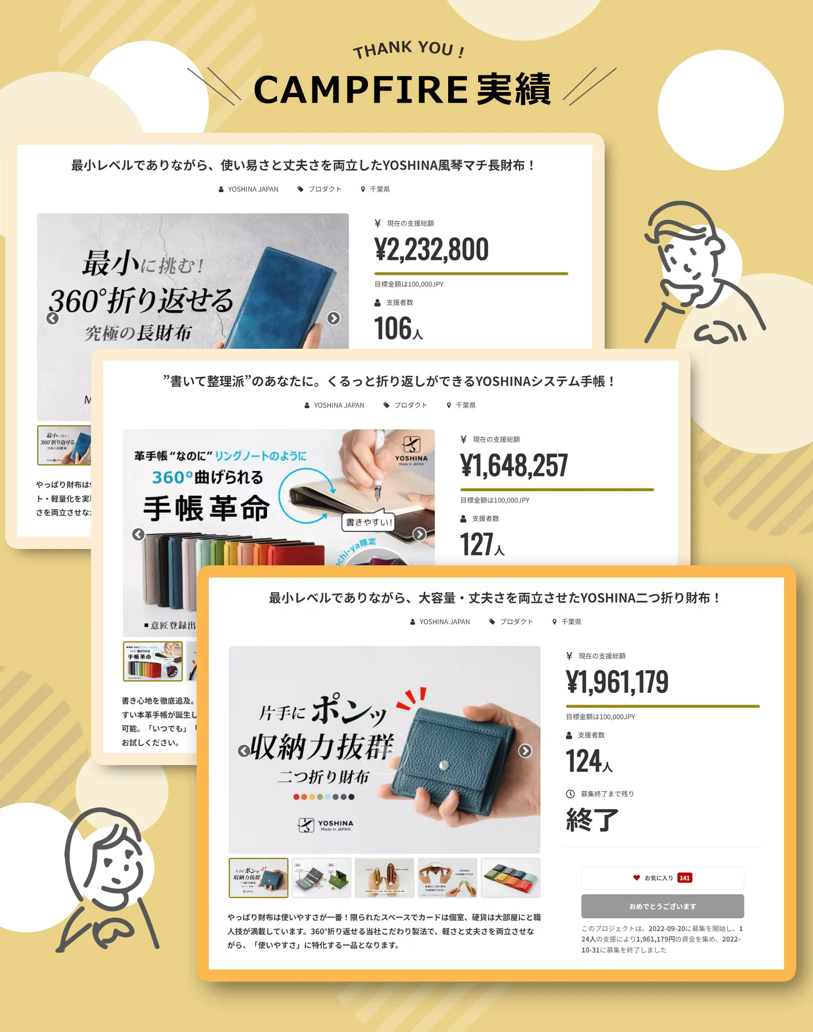 今回、YOSHINAコンパクト二つ折り財布について、多くの方から「リピート購入したいが、新色はないか」、「季節に合う色が欲しい」などのご要望を受け、Campfireのアンコールプロジェクトキャンペーンに参加することとなりました。