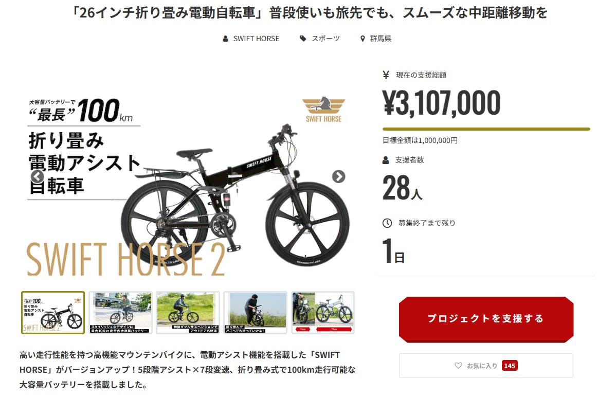 支援者の皆様、お気に入り登録をしてくださっている皆様こんにちは。福田国際株式会社です。本日、1月12日23時59分を持ちまして、SWIFT HORSE2のプロジェクトが終了いたします。皆様のご支援、ご声援いただきまして誠にありがとうございます。
