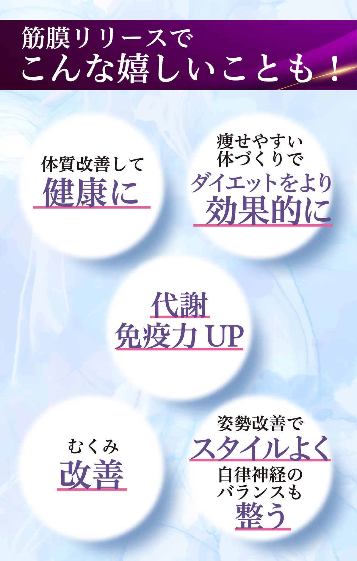 筋膜の癒着を解放し、血流とリンパの流れを良くすることで動きにくい部位の固さや疲れが軽減され、身体の柔軟性が上がったり、ダイエットの効果も得やすくなります。