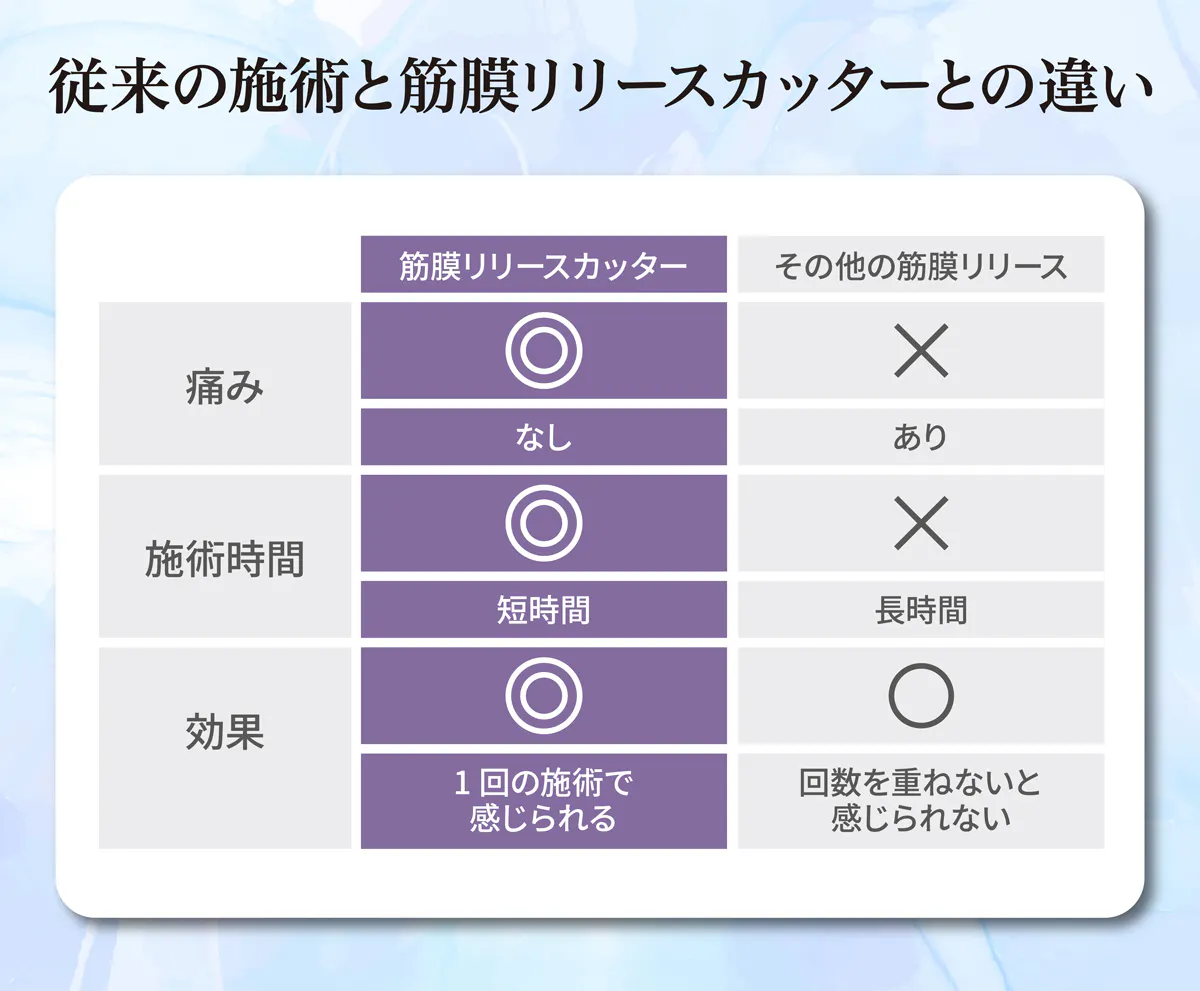今回導入予定の「リリースカッター」は、短時間で効果を得やすく、痛みを感じにくい筋膜リリースを実現した最新の美容機器です。