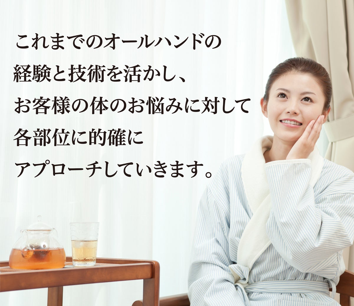 これは自分でも様々な施術を受ける中で、やはり手で行うトリートメントは、人のぬくもりや心地よさが感じられ、その気持ちよさをお客様にも感じていただきたい、という想いがあったからです。