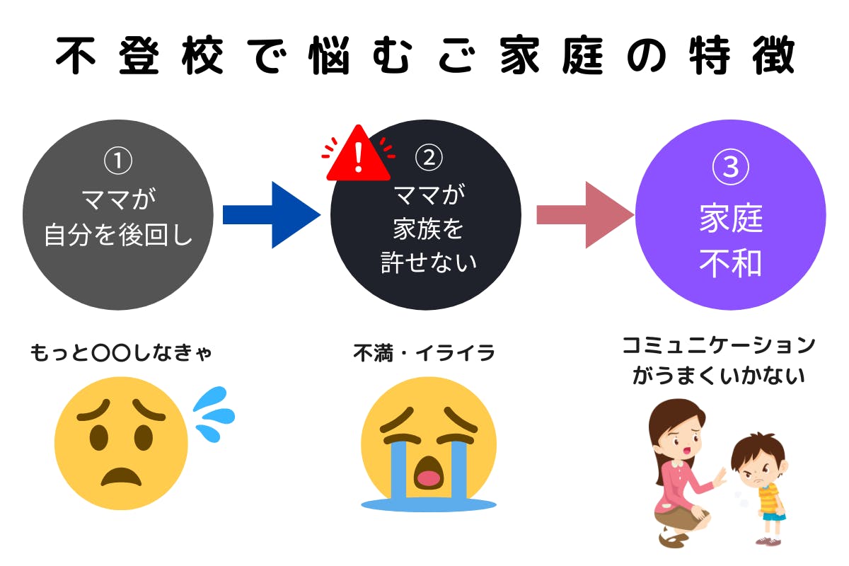 不登校で悩むご家庭の特徴は、下のイラストの通り、ママが自分を後回しにし続けていることで、不満・イライラなどが爆発し、家族とのコミュニケーションがうまくいっていない状態になっていることが多いです。