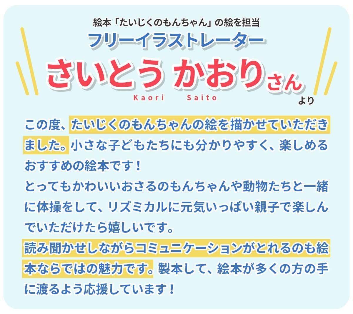 また、絵本たいじくのもんちゃんを通じて、親子のかけがえのないコミュニケーション、スキンシップの一助になって頂けたらこんな嬉しいことはありません。