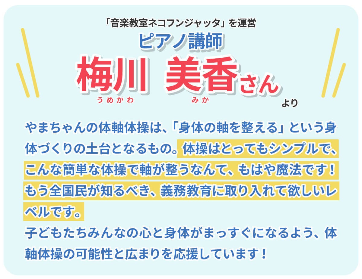 子どもの姿勢を改善させ、運動機能を高める事ができるこの体軸体操を小さなうちから楽しく学び、子どもたちには身体を動かす事が好きになってもらいたい。
