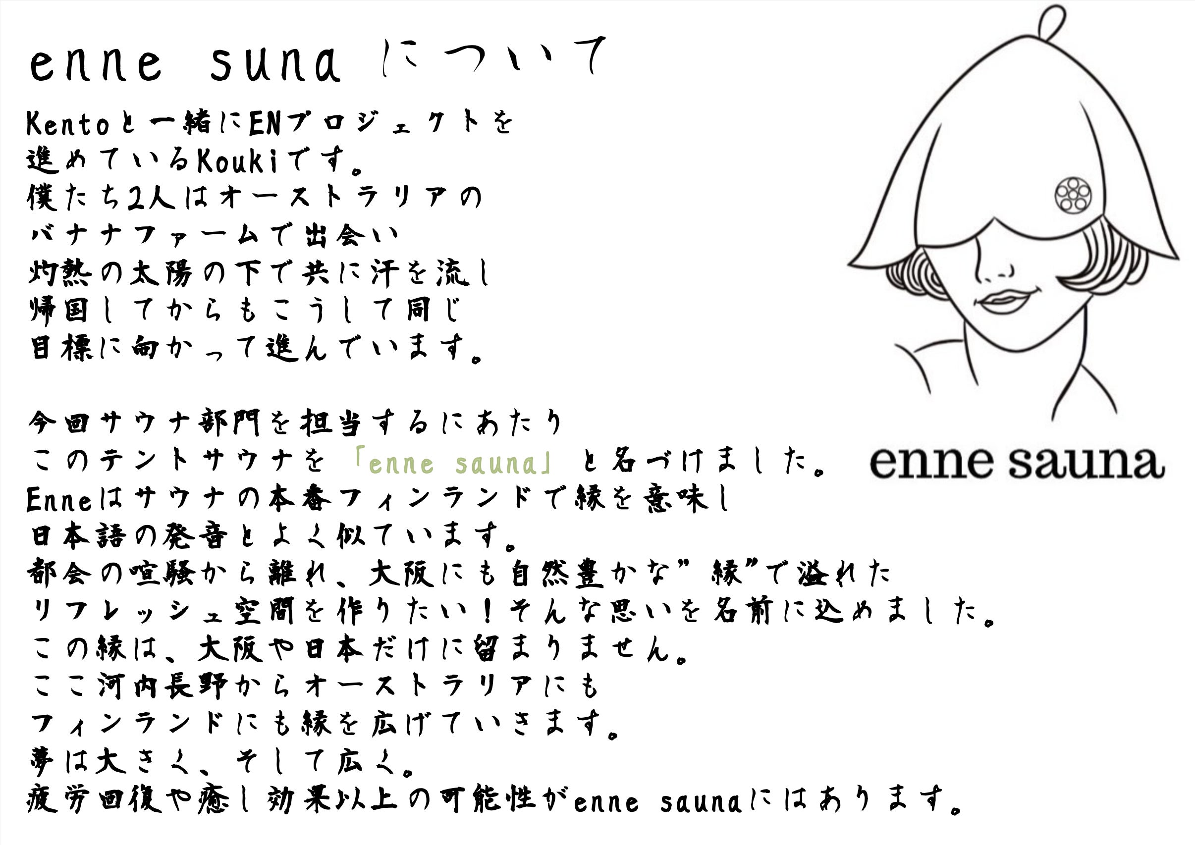 enにはさまざまな意味を込めています。人の「縁」、楽しい「宴」会、Enjoy 楽しむ、Environment 環境、Encounter 出会い、そしてEnthusiasm (エンスージアズム) 熱狂です。