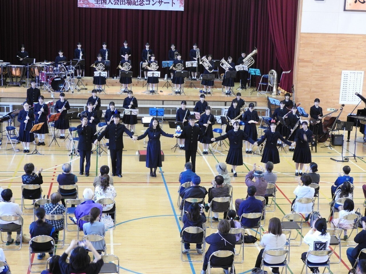 10月初旬、全国大会出場が決まり、急遽、地域の皆様へご報告のために、全国大会出場記念コンサートを開催しました。写真は新城中の体育館で行われたコンサートの様子です。
