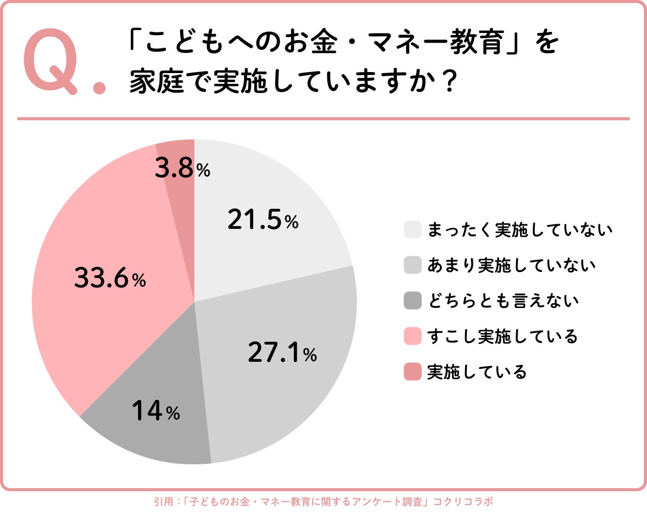 高い関心の一方で、「実際にマネー教育を家庭で実施していますか?」という質問に対しては、約半数の親が「全く/あまり実施していない」という結果に。「実施している」と明快に答えた親はわずか3.8%にとどまっています。