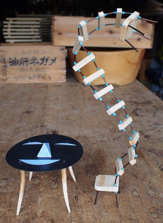 「かおづくえ(顔机) と しゃくとりいす(尺取り椅子)」の模型です。かおづくえは、ポリカーボネイトと木の枝と紙で作られています。しゃくとりいすは、木っ端と太いアルミ線と青い養生テープで作られています。下絵はこの模型を元に、フィン・ユールの優美さをプラスして描きました。デザイン的・構図的にかなり苦労した下絵です。