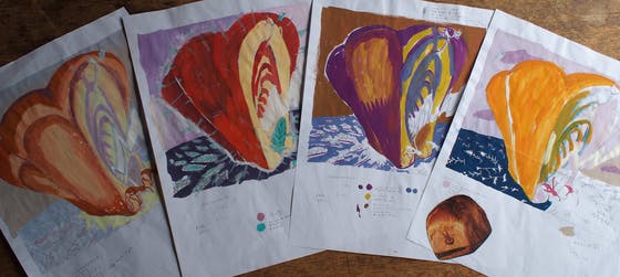 『C.パンの家の様子がおかしい・・・グルグルグルグル、なにやら渦巻いている』の下絵です。いろいろ試します。最終的には一番左の絵を選びましたが、パンの家シリーズ全体の構図を考えて絵を反転させました。だから逆向きになっています。