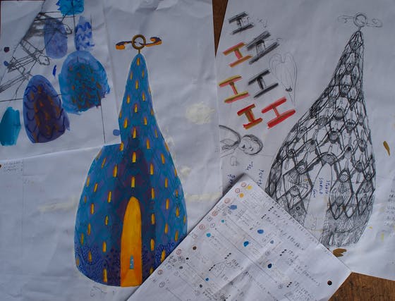 『とうきのありづか』の鉛筆デッサン&色違いヴァージョンです。この時はまだ、塔のてっぺんでクルクル回る真鍮の輪っかから雲が出ています。でも、採用した下絵には雲はありません。その方がバランスがいいと感じたからです。