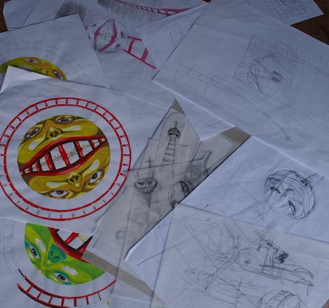 『くるりとかわる』の周りを囲む赤いハシゴは、最初はまっすぐだったり、ジグザグだったり,いろんな形がありました。でもそうすると、「くるりとかわる」自身が小さくなってしまうので、「赤いハシゴ伴っても大きく見えるためには・・・?」と考えた末、今の形になりました。