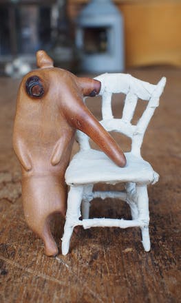 『ヘチ君』です。素材はモチノキです。柔らかく彫りやすい木で、仕上げにオニグルミの油を染み込ませています。『ヘチ君』のヘチは、漢字で『丿』と書きます。カタカナの『ノ』に似ていますが、よく見ると違います。戦国時代後期から安土桃山時代にかけての伝説的な茶人、丿貫(へちかん)に由来します。
