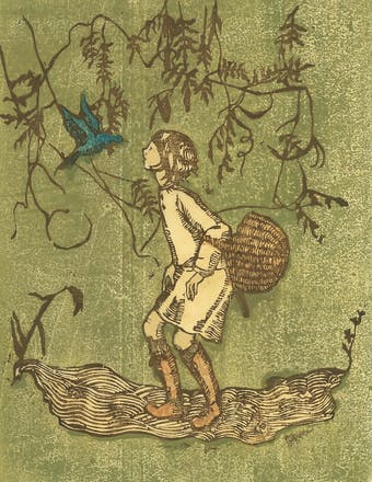 『ふじづる』。青い鳥やかごの周りなどに絵具溜まりがあります。未熟です・・・でも、雰囲気があらわれていて、好きな作品のひとつです。個展の時、若い男性の方がじっと見続けていらっしゃったのがとても印象的でした。