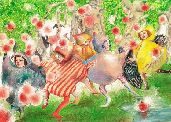 『りんご娘』。近くのリンゴ園に頼まれたポストカードの原画です。私たちが住んでいるところは、リンゴの産地なのです。道端の直売所では市場に出回らない、いろんな種類のリンゴが毎週毎週、袋詰めされて売られています。シーズン中に20種類以上のリンゴが出回るでしょうか・・・