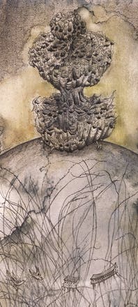 『スズメバチの巣の丘」。天井裏にスズメバチが巣を作りました。うなるような羽音が始終、聞こえてきます。秋も深まり、巣が空っぽになった頃を見計らって、天井裏に頭をつっこみ巣を撤去しました。スズメバチはもういないとはいえ、彼らの残した構築物にはぞわぞわしました。