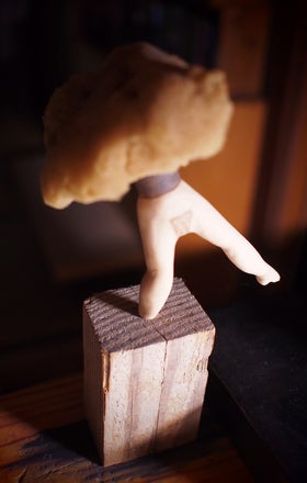 『雲をかぶる・・・』。椿の木と海綿と廃材と鎌の口金で作っています。椿は剪定したものを、海綿は萩の海岸で拾ってきたものを使っています。