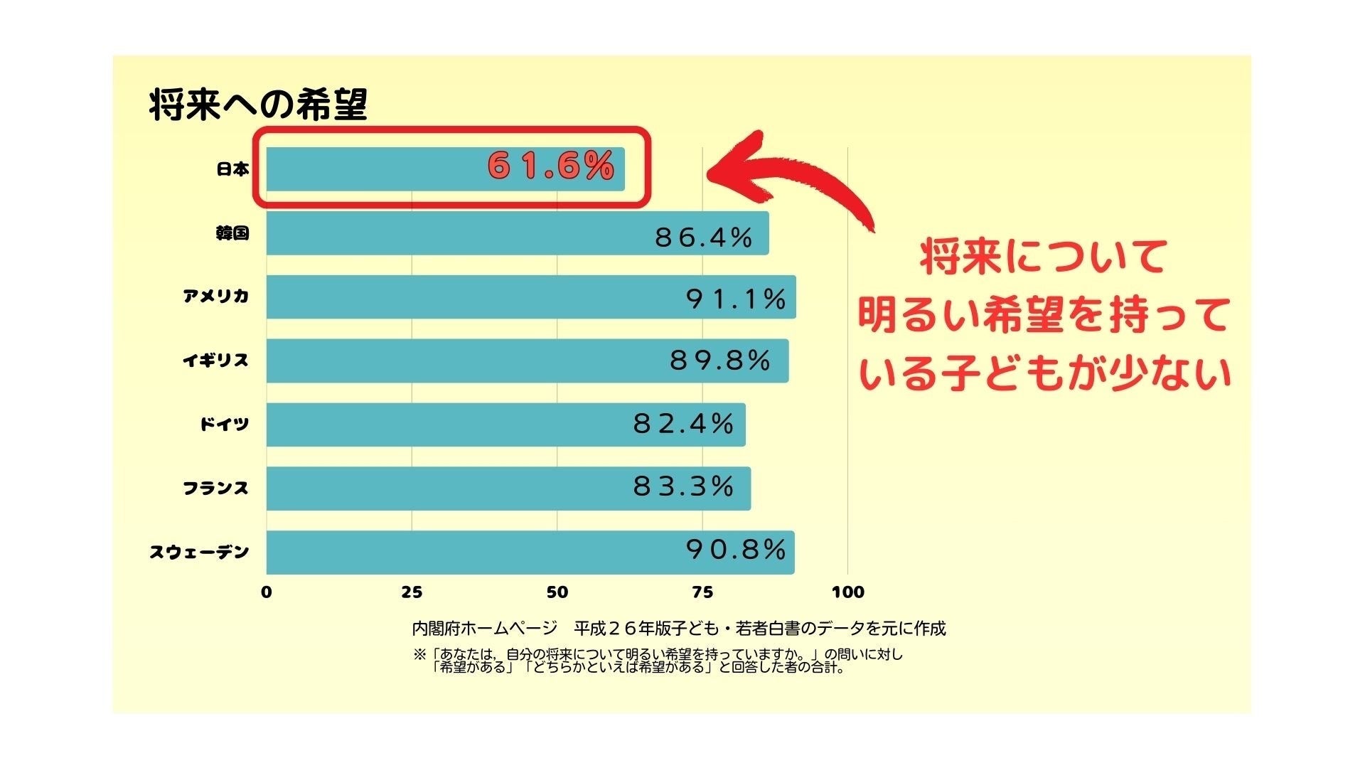 諸外国の子どもたちに比べて自己肯定感が低く、自分に自信がない・自分には価値がないと思う日本の子どもたち。さらには、自分の将来に明るい希望がもてない子どもたち。不登校やひきこもり 、自死、いじめ、虐待の相談件数も増え続けていて、子どもも大人も未来への希望を持てない社会になりつつあるのが現状です。