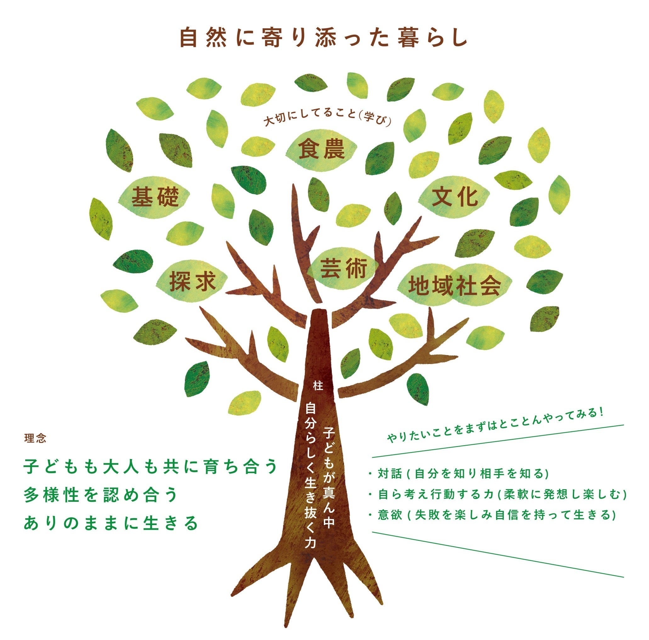 私たちは【大人も子どもも対等であり、子どもが自ら育つ力を信じる】を真ん中に、この森の寺子屋を【新たな選択肢の学び舎】として仙台から発信していきます。