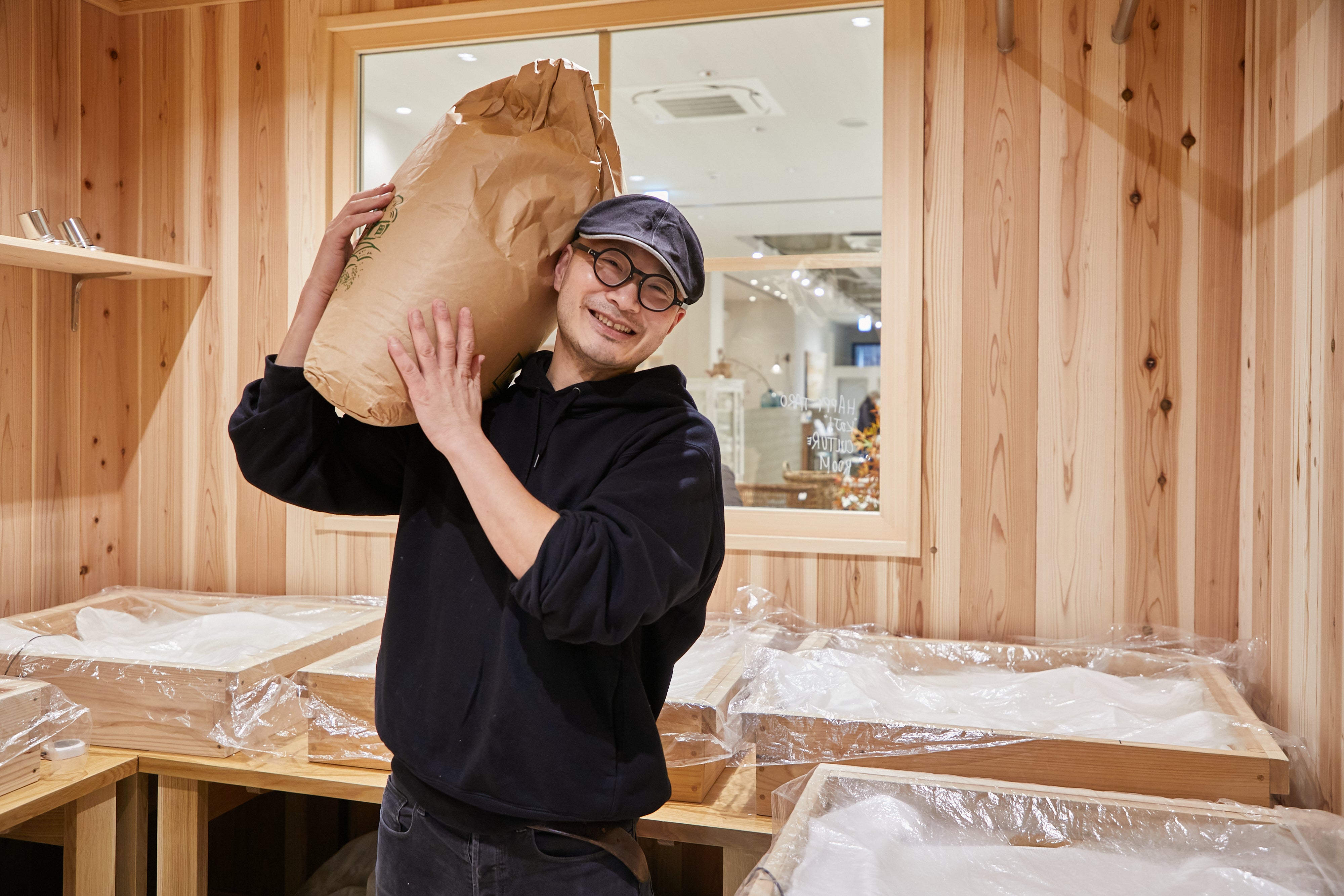 ご自身の糀室でお米を担ぐハッピー太郎さん。