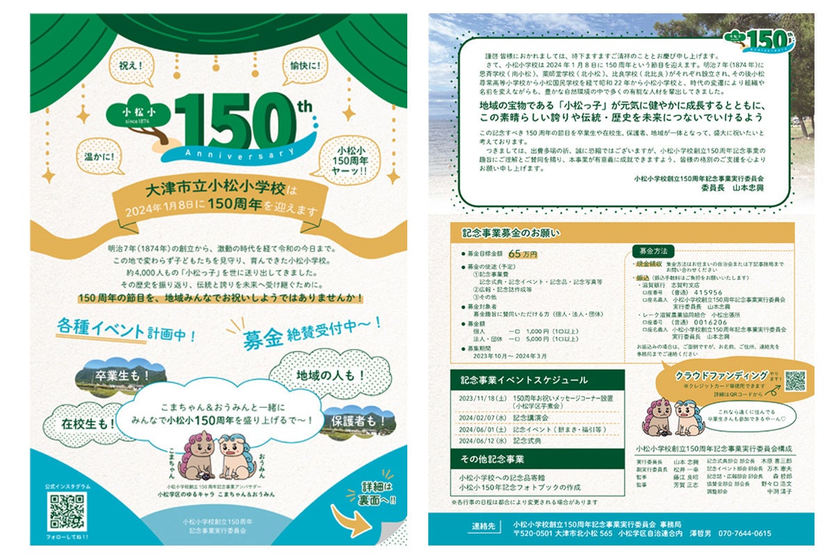 現在、学校・PTA・地域住民が連携して実行委員会を立ち上げ、様々な企画を検討していますが、住民の方からの寄付や地元企業による協賛だけでは、なかなか資金調達が難しいのが現状です。 そこで、遠く離れて暮らしておられる卒業生「小松っ子」の皆さんや、趣旨にご賛同いただける皆様から広く寄付を募りたいと考えました。