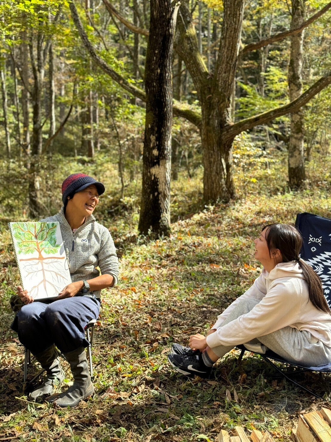 スタッフは、一緒に森のどこかに滞在しています。そのスタッフは、ひとりで本を読んでいたり、お絵描きをしていたり、好きなことをして過ごしています。