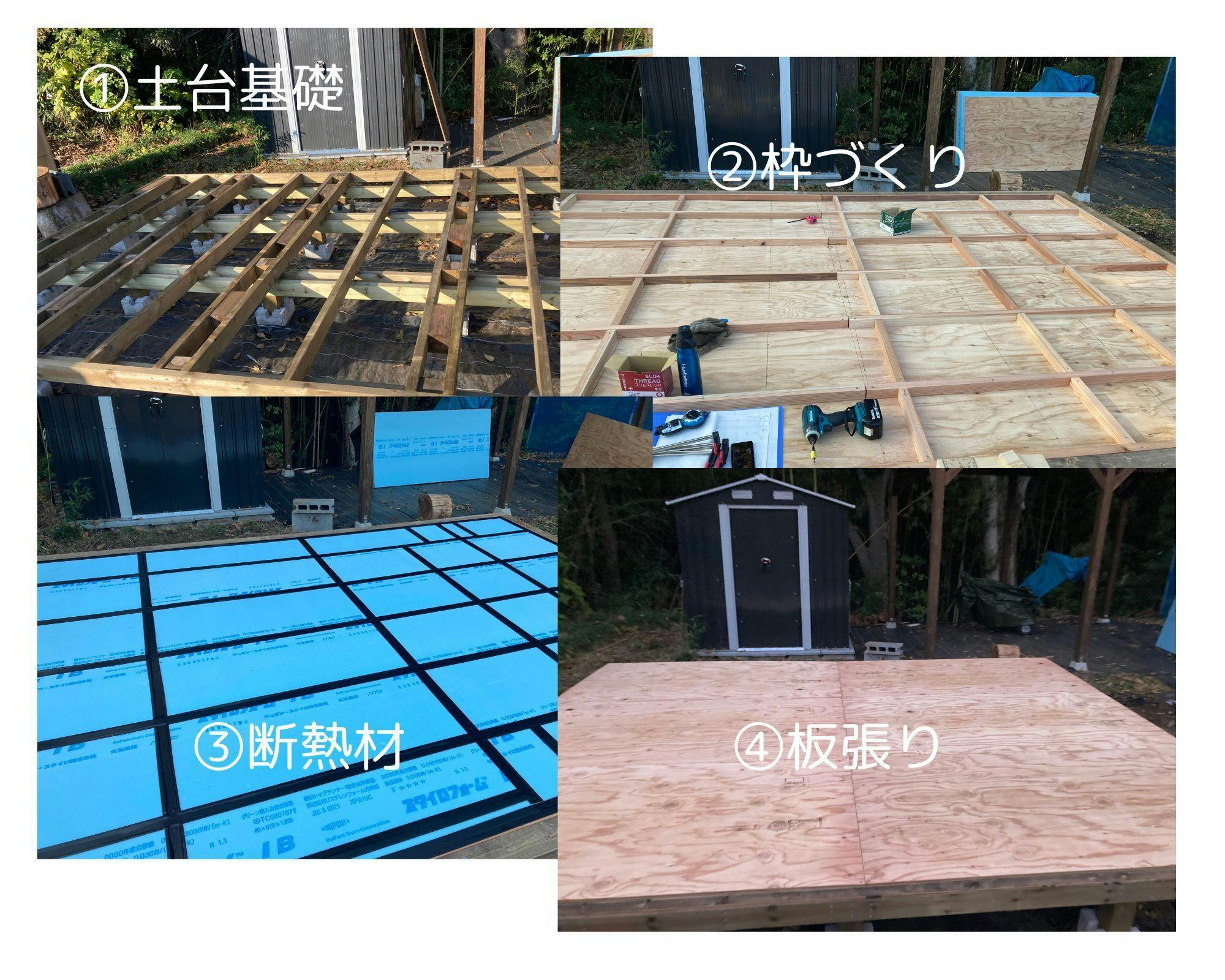 板1枚の厚さは12ミリ。それだけだと寒いので、断熱材を敷き詰めました。そして上から板をネジネジしました。完成間際には、さらに床材を張る予定です。