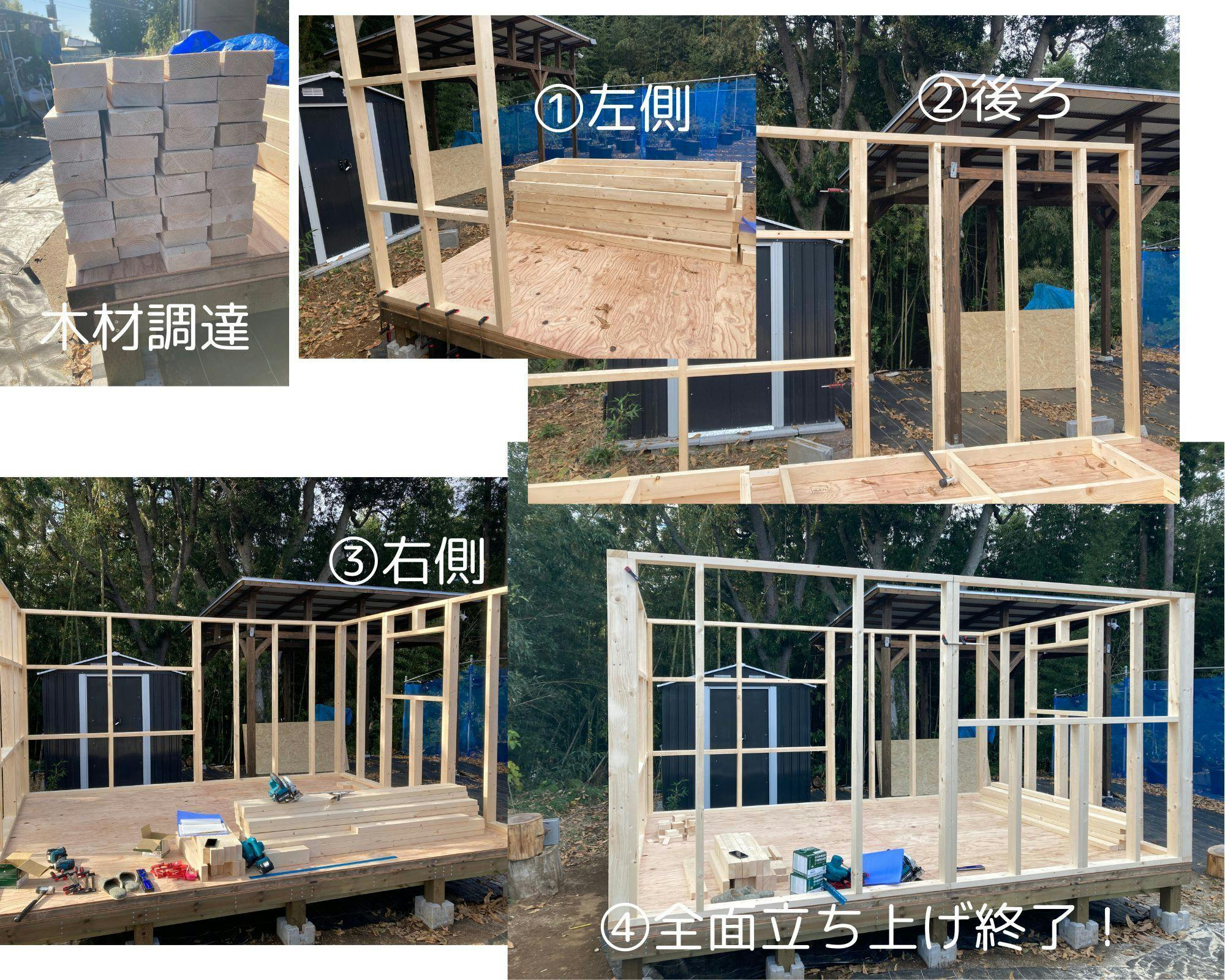 今回は、ホームセンターで買った木材を枠組みし、柱を立ち上げました。