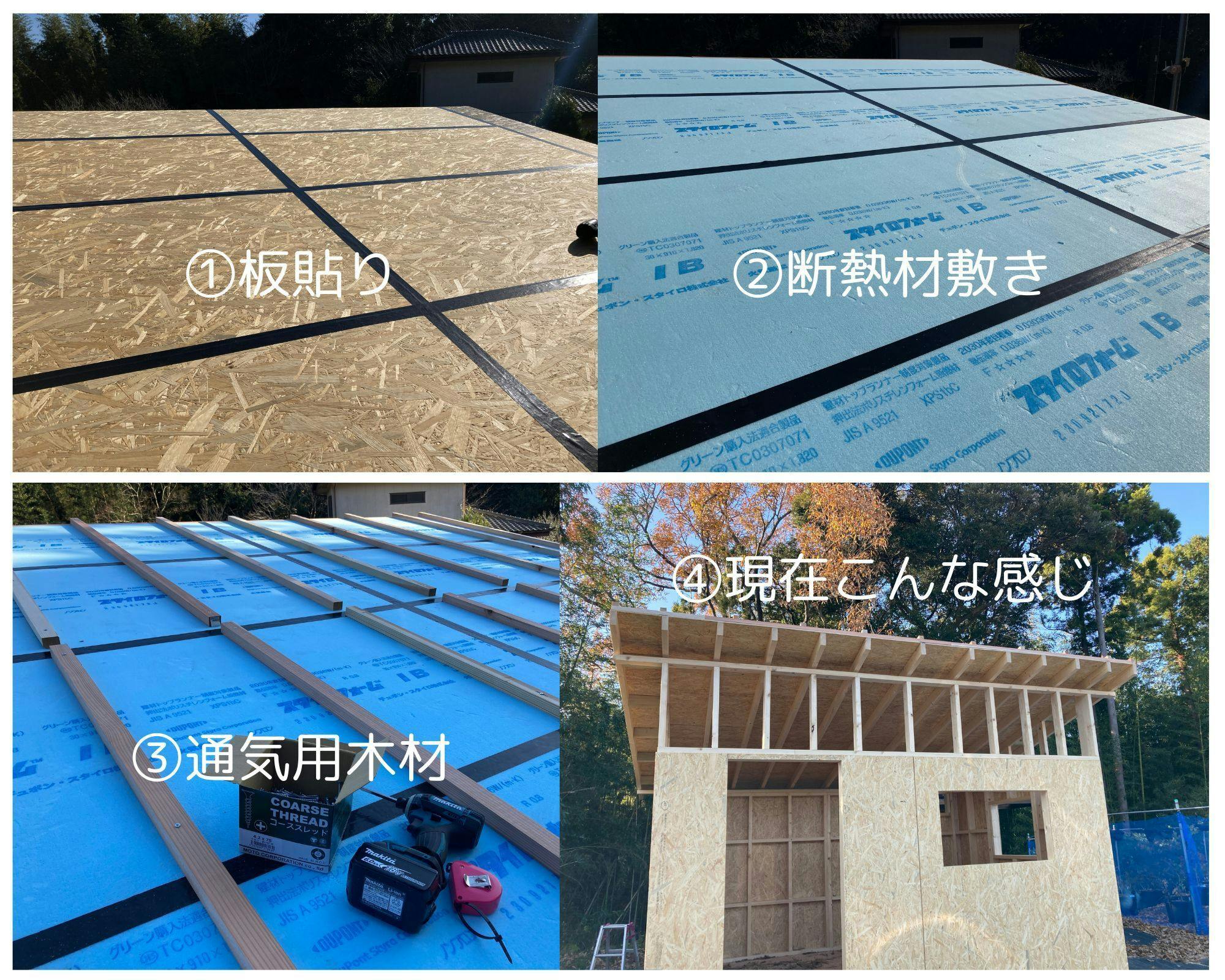 残り作業は、板貼り、防水シート貼り、屋根材を取り付けます。