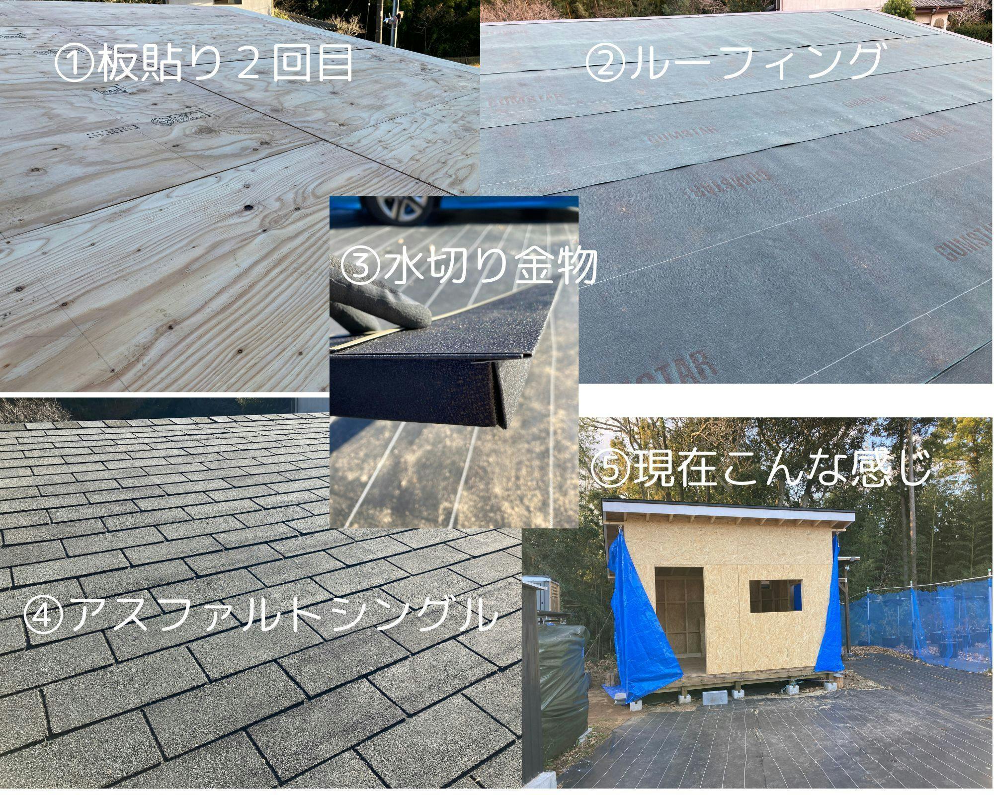 うちの小屋の屋根は下から板、断熱材、通気用木材(←前回はここまで)、板、ルーフィング、水切り金物(周囲)、アスファルトシングルとなっています。