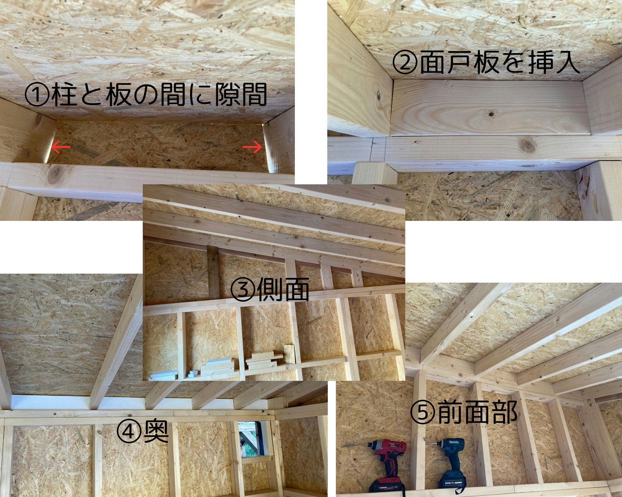 室内側から面戸板(めんどいた)を仕込みました。写真①のように軒桁(のきけた)と垂木(たるき)の高低差や板材との間に隙間ができてしまいます。その隙間を埋めるために入れる板のことをいいます(外敵侵入遮断)。
