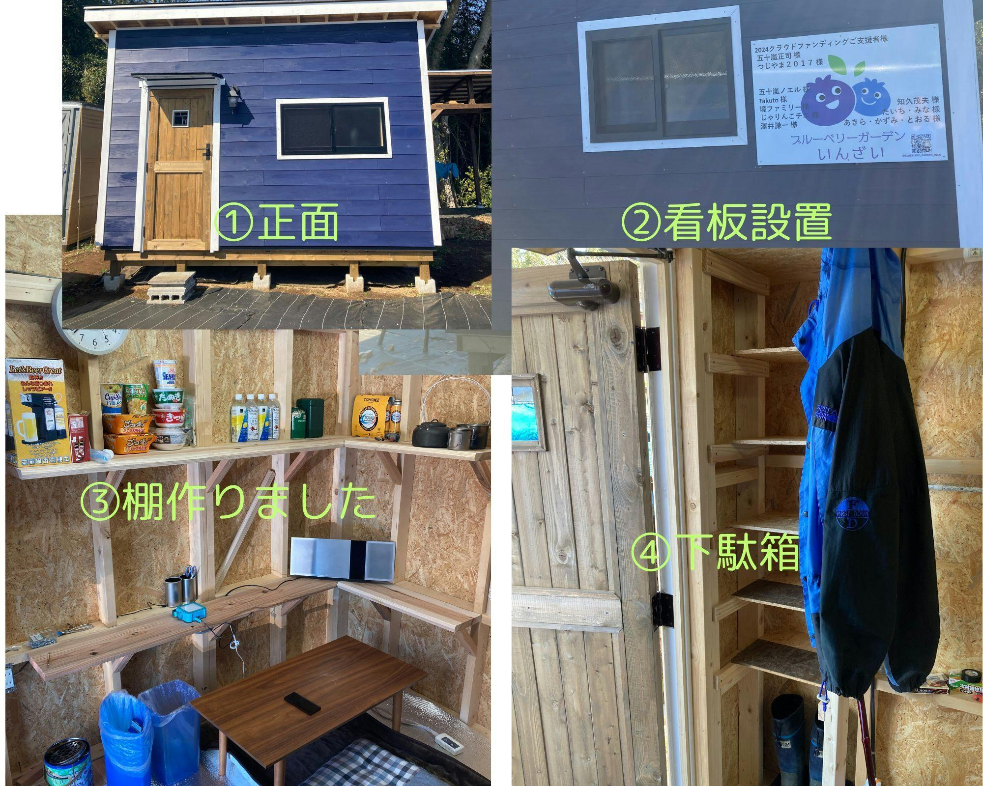 室内の壁に棚を作りました。余った端材を活用してみました。まぁ何とかなった。農機具倉庫から食料品などを持ち込み、快適に過ごしています。