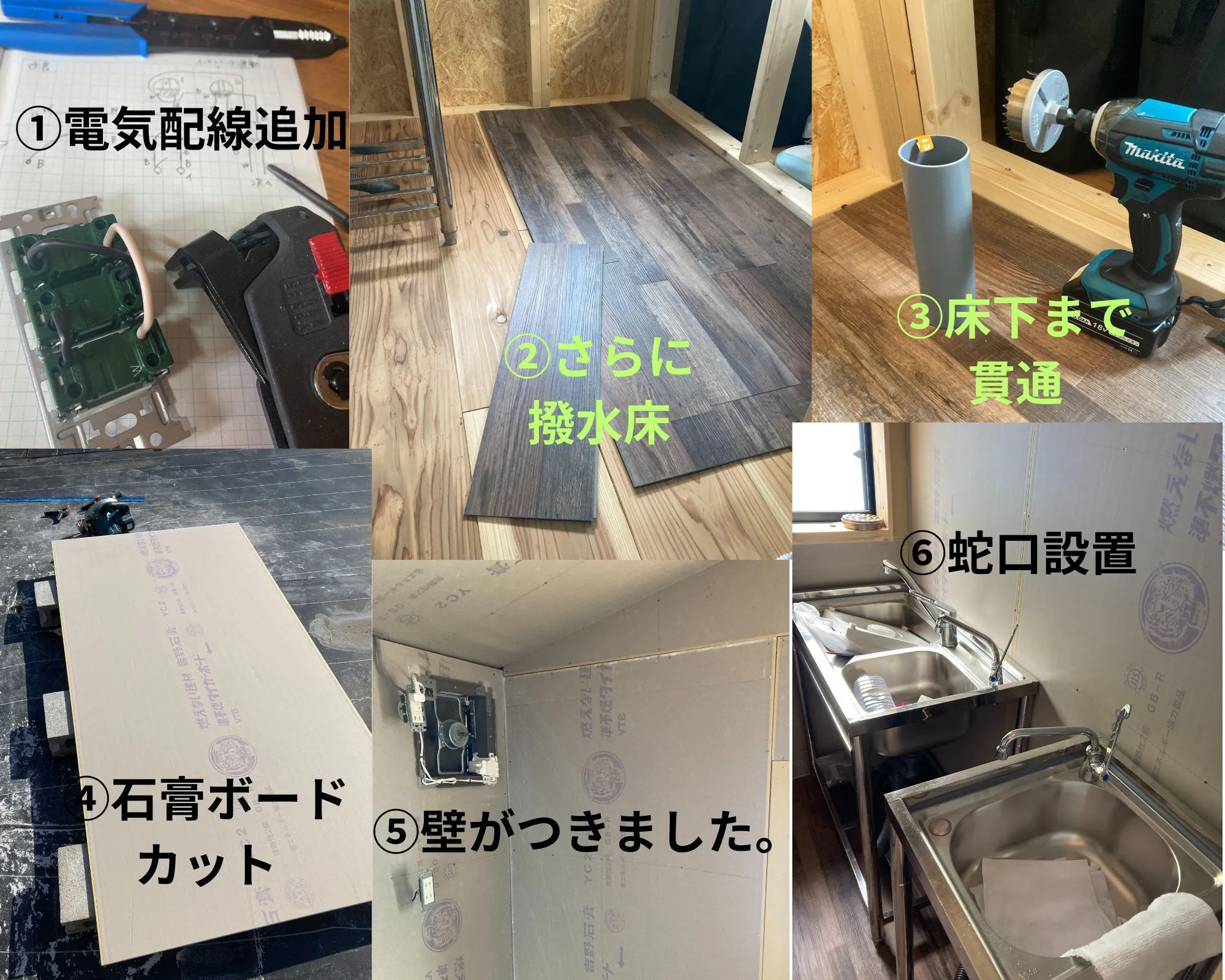 ④⑤壁は石膏ボードをつけました。1枚10キロで重たかった。あとは壁紙を貼っていきます。