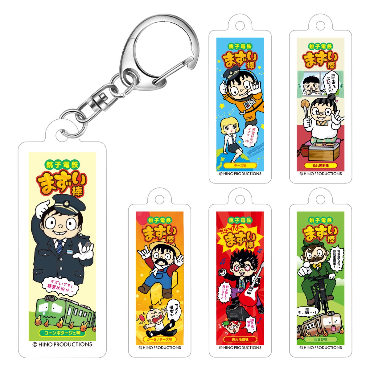 ●まずい棒アクリルキーホルダー6種セット(コーンポタージュ、チーズ、ぬれ煎餅、炭火地鶏、か~るいチーズ、わさび)