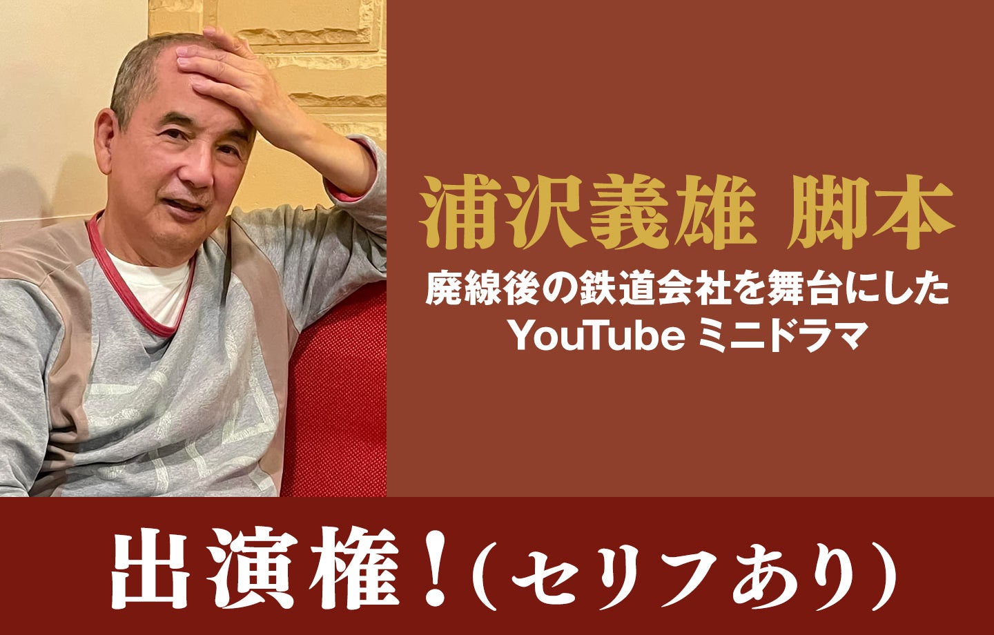 ●『名探偵コナン』『忍たま乱太郎』『激走戦隊カーレンジャー』『東映不思議コメディーシリーズ』などで知られる浦沢義雄さん脚本!廃線後の鉄道会社を描いたYouTubeミニドラマの出演権!(セリフあり)