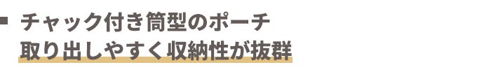 チャック付き筒型のポーチは、取り出しやすく収納性が抜群で、出し入れや片付けの際にノーストレスです。