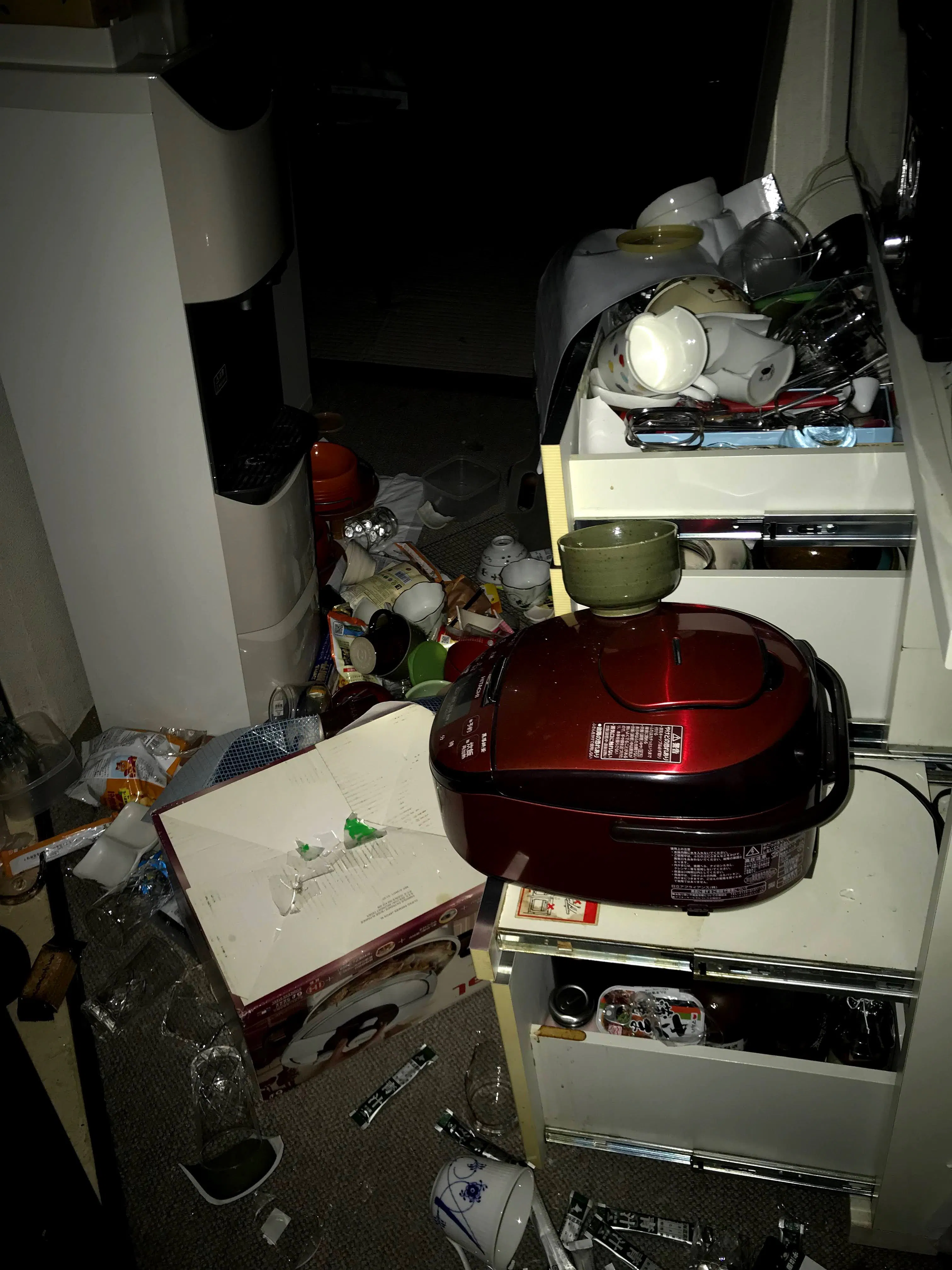 ・サークル内で寝られるようクレートトレーニングをしていたので、落下物や家具の下敷きになることなく過ごせた