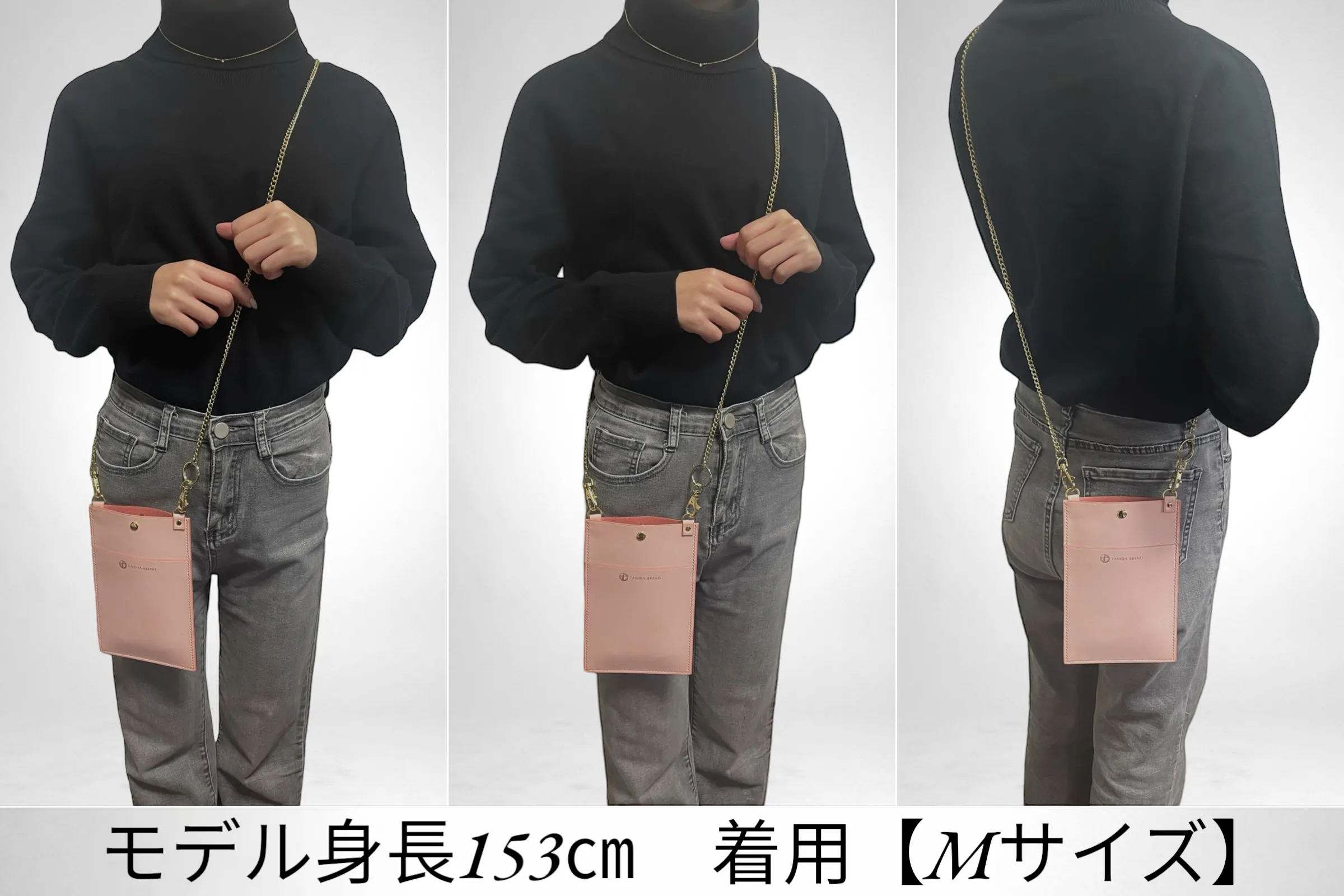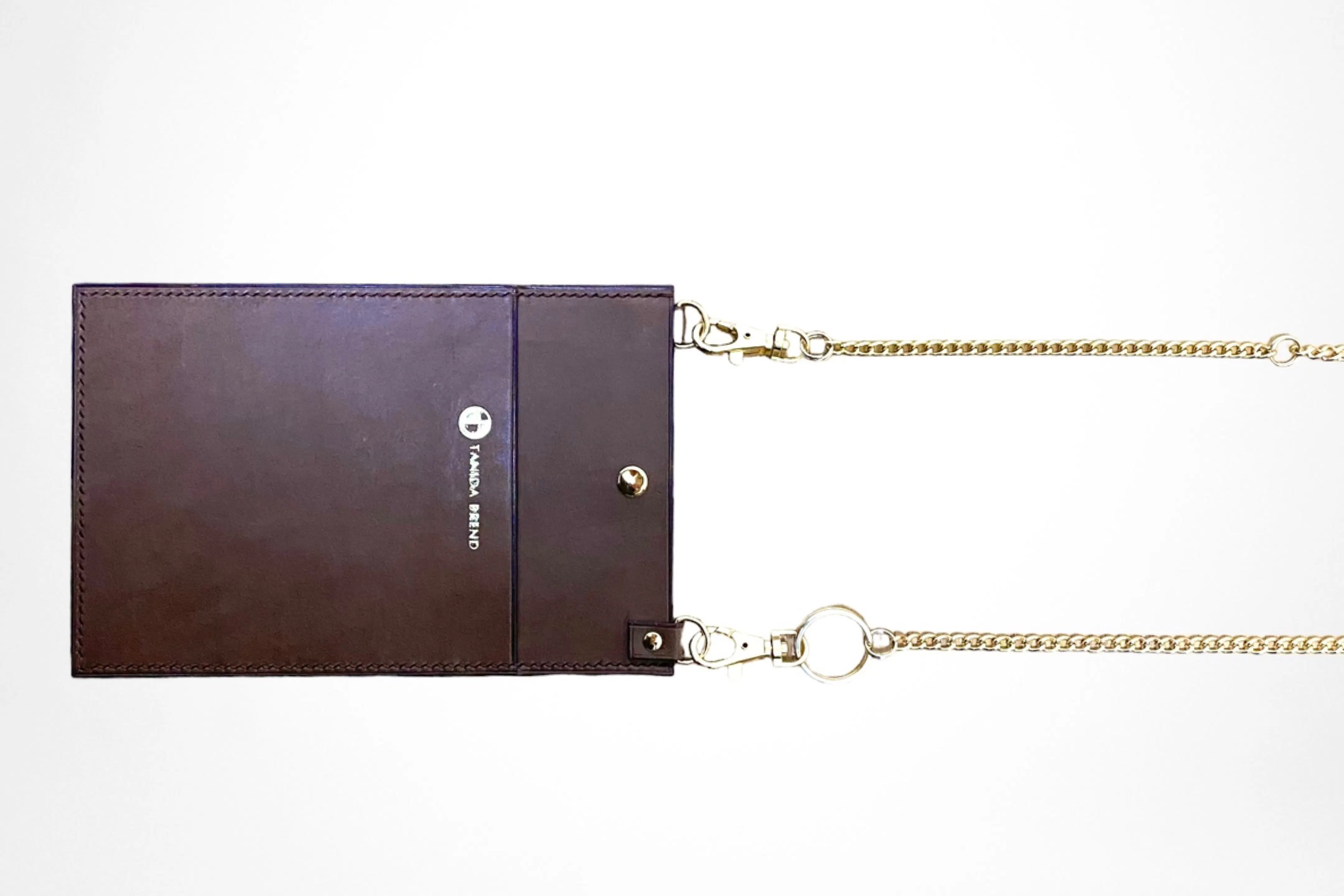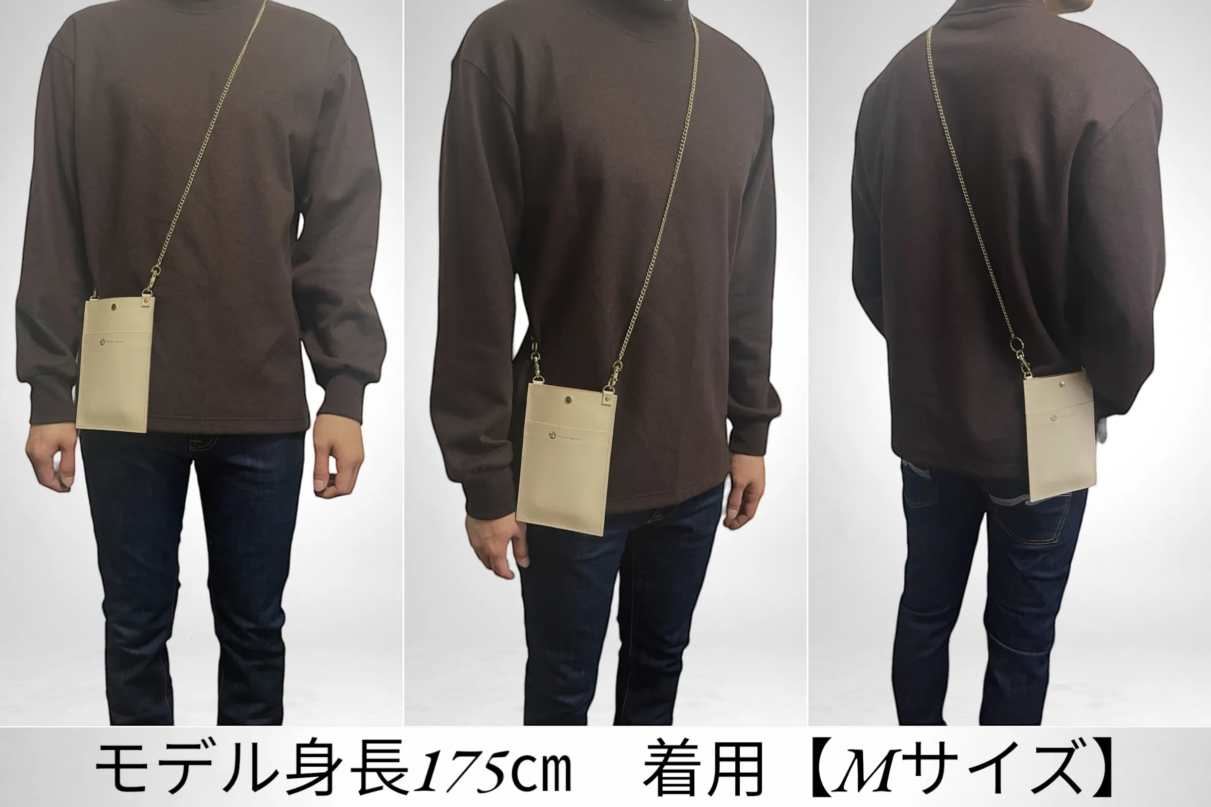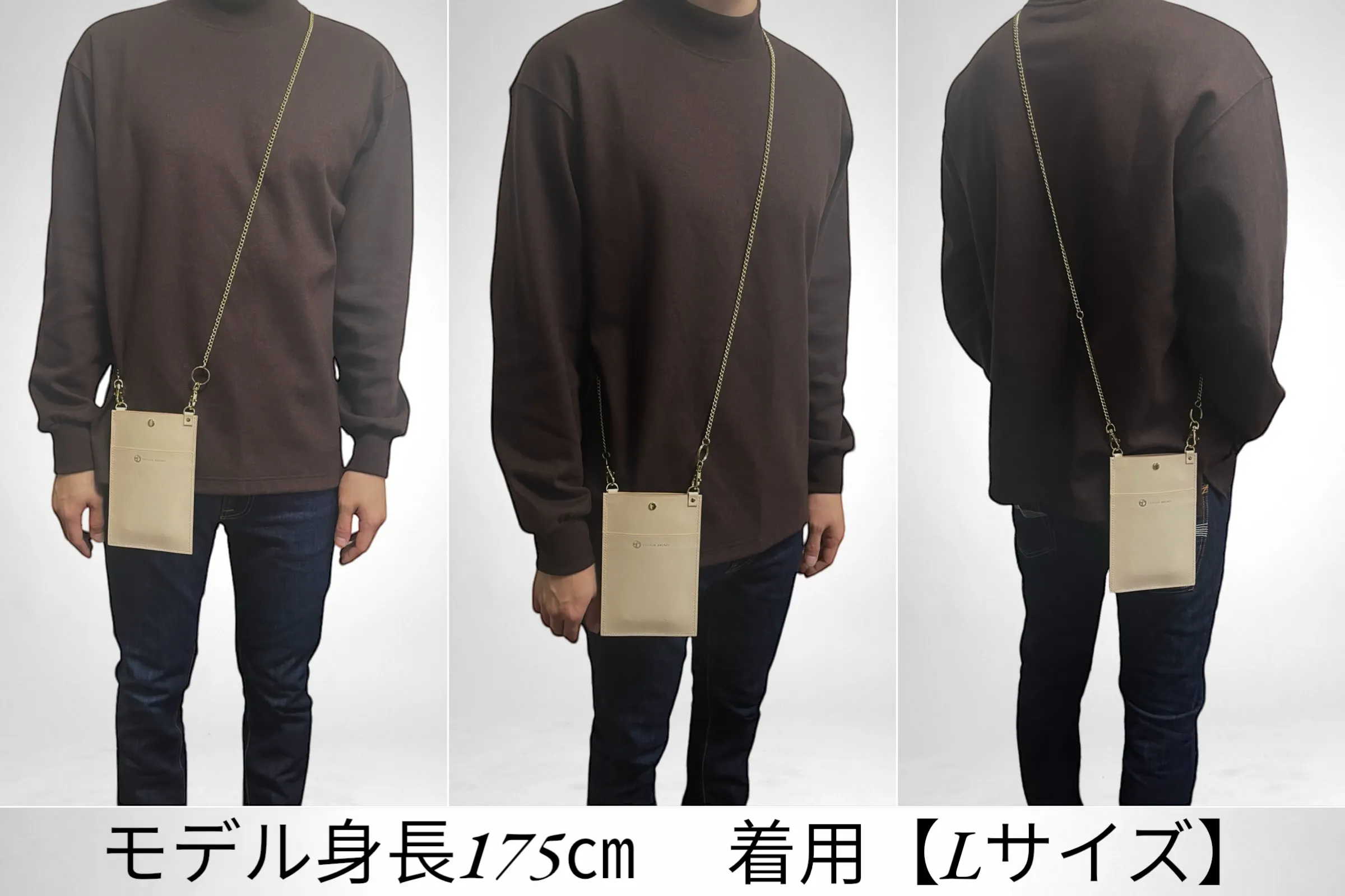 コートやダウンの邪魔にならない薄さに設計しているので着崩れをしないデザインとなっています。また、ショルダー部分を高級感あるチェーンを使用する事によりただの機能的なスマホショルダーではなく、余裕のある大人へと演出するアイテムとなります。