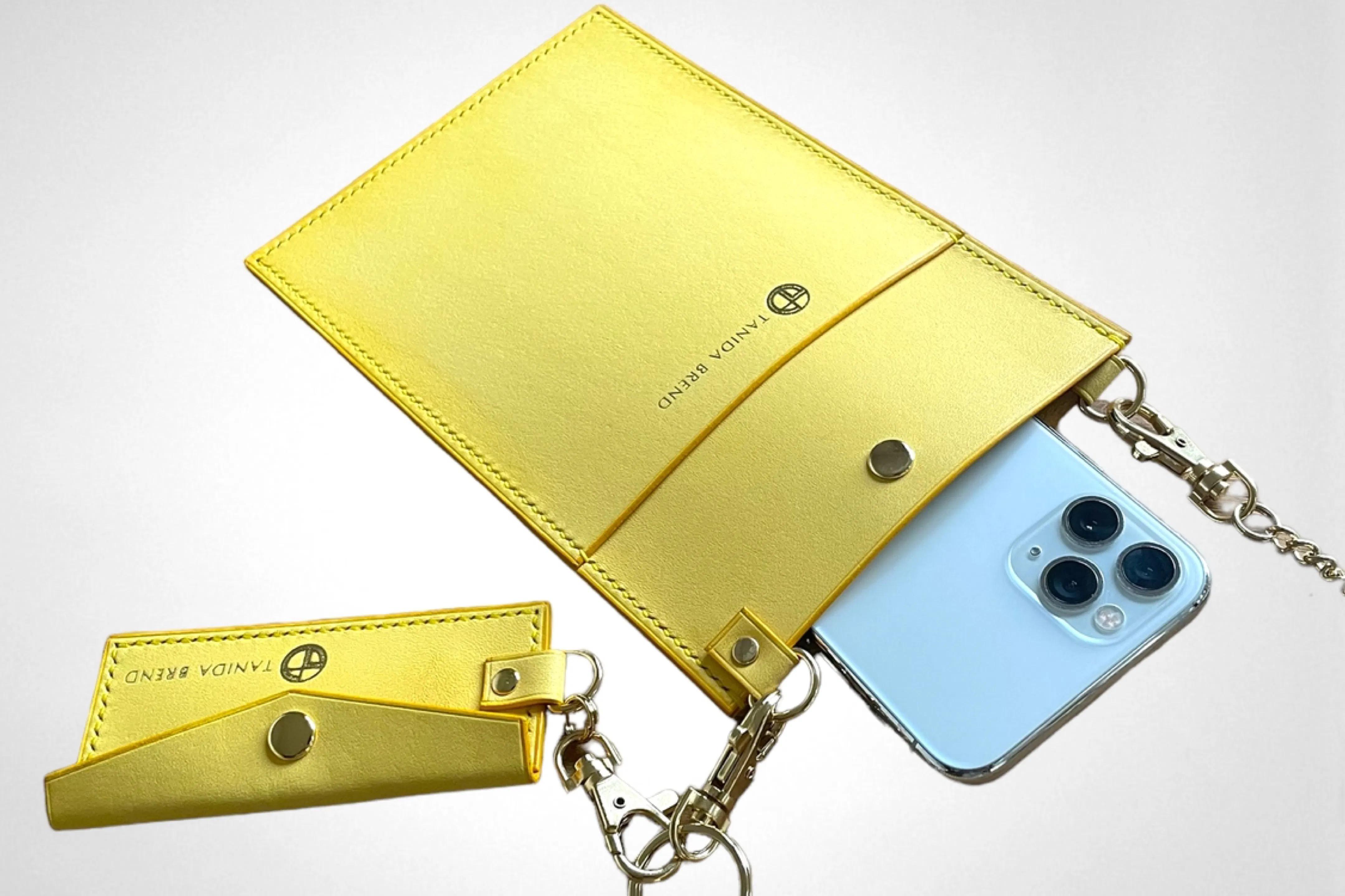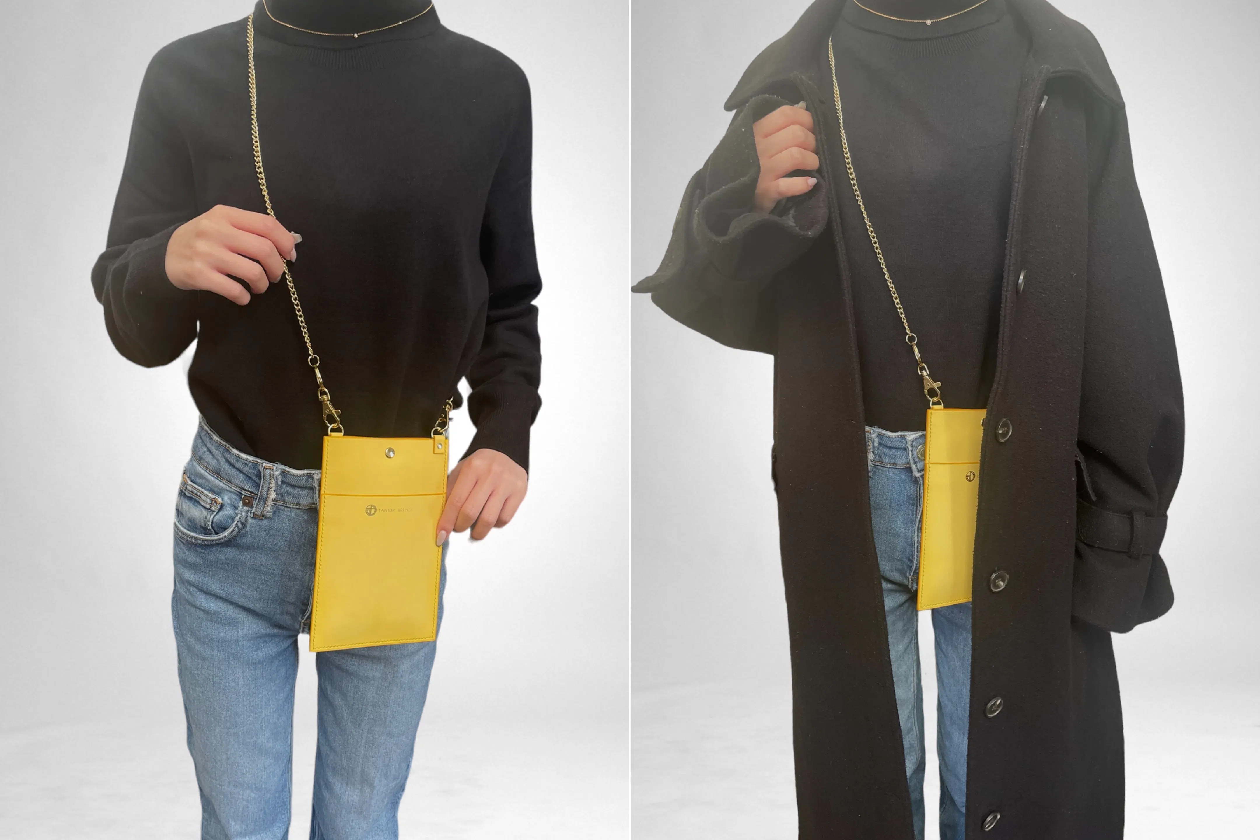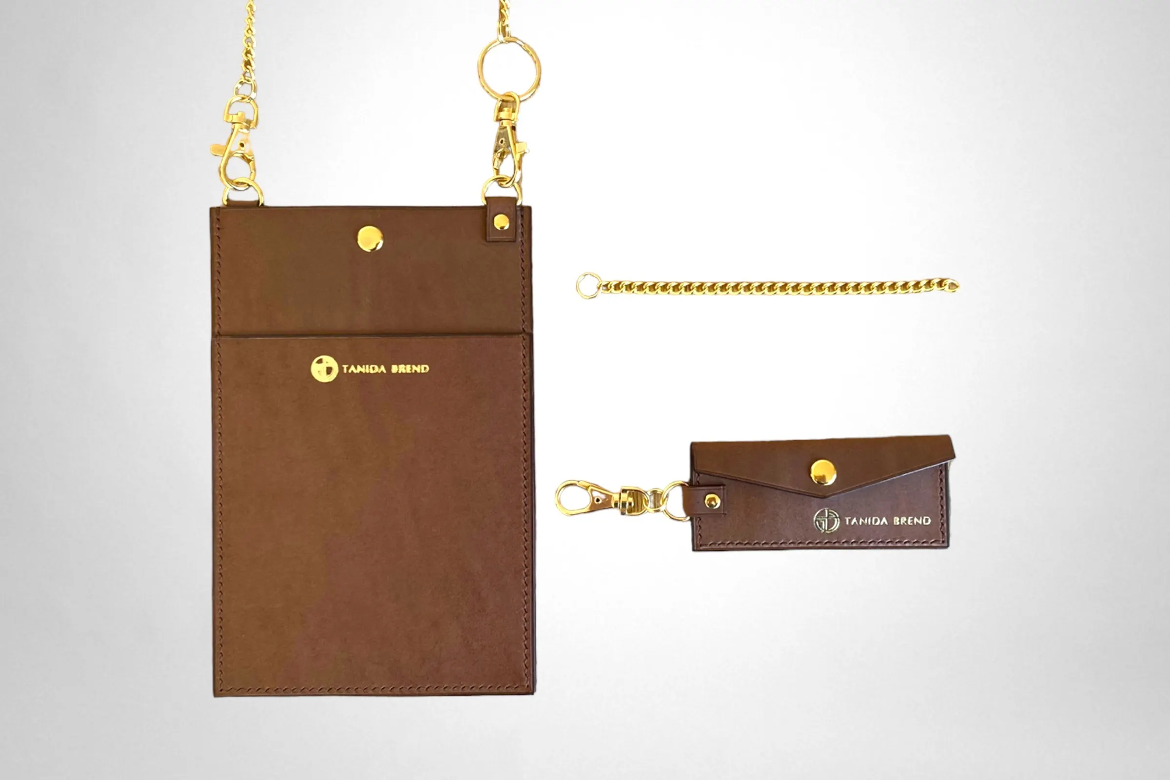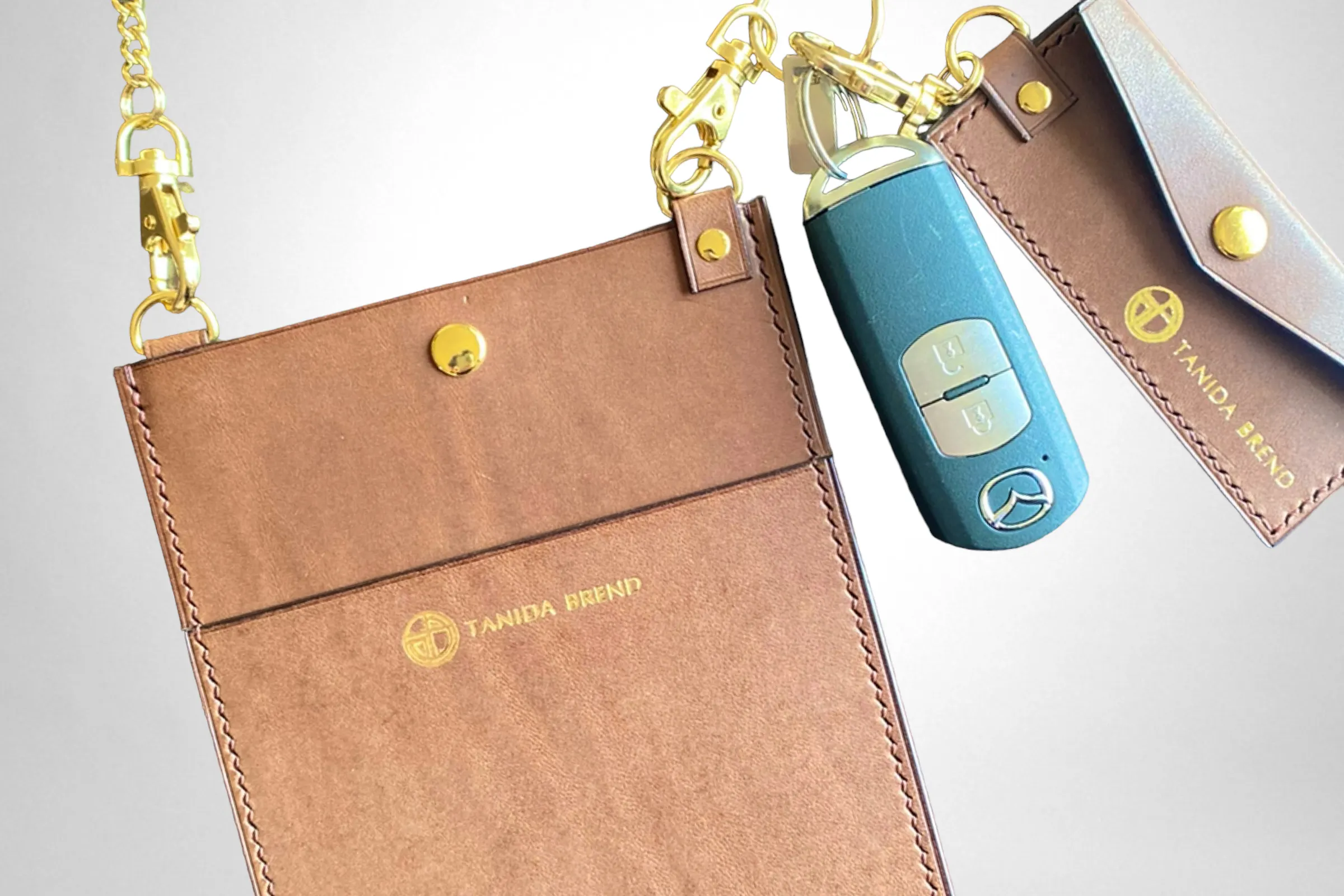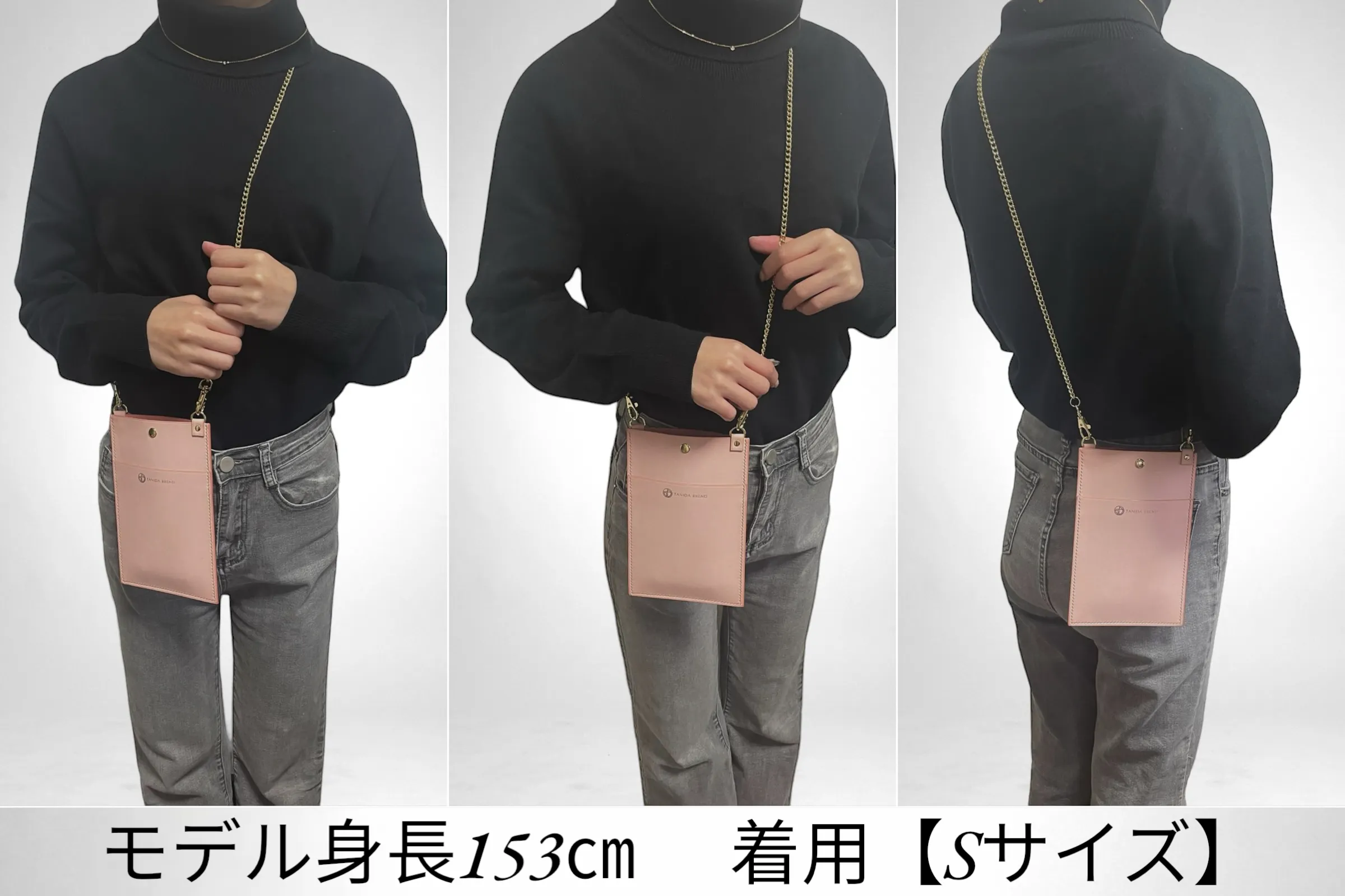 コートやダウンの邪魔にならない薄さに設計しているので着崩れをしないデザインとなっています。また、ショルダー部分を高級感あるチェーンを使用する事によりただの機能的なスマホショルダーではなく、余裕のある大人へと演出するアイテムとなります。