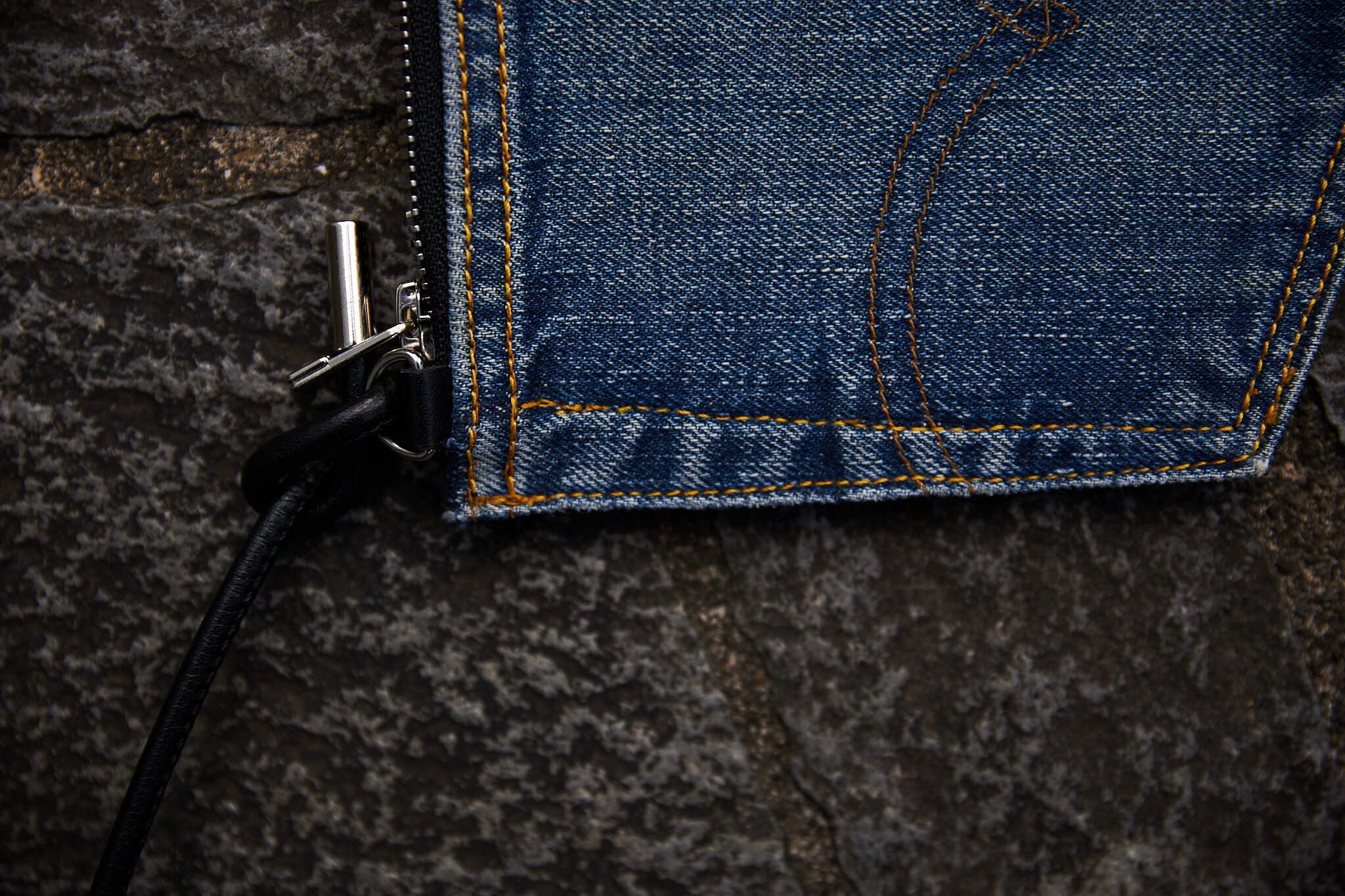 デニムのポケットの裏面には、タンニン鞣しの上質なレザーを採用。レザー面の下部にブランドのロゴが入ります。